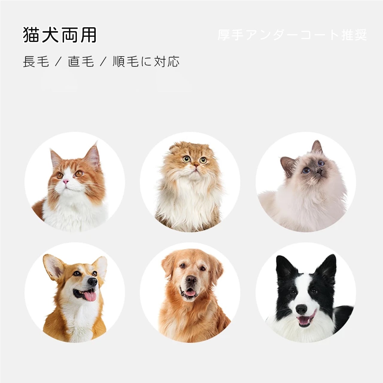 厚手のアンダーコートを持つペットに最適推奨,長毛・直毛・順毛の猫・犬全品種に対応。小型犬・中型犬・成猫・子猫まで、家庭で飼育されるほとんどのペットに適用可能。