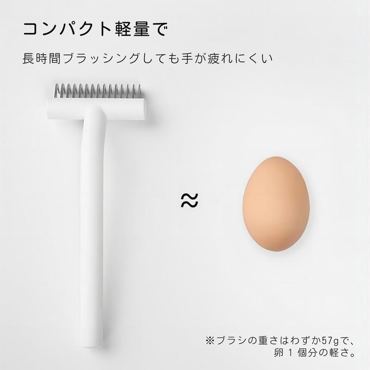 梳き取った毛はワンタッチで取り除ける設計(または簡単に掃除できる構造),使用後は冷水 / ぬるま湯で水洗い可能,自然乾燥させるだけで衛生的に保てる。コンパクトサイズで保管スペースをとらない。
