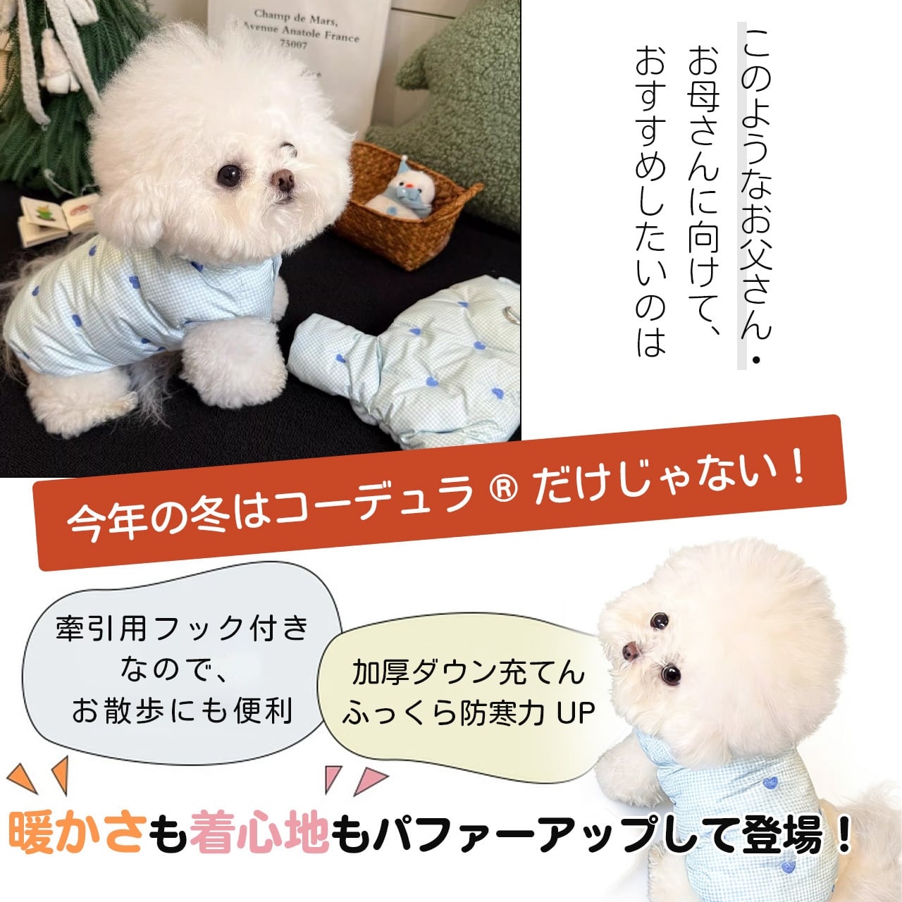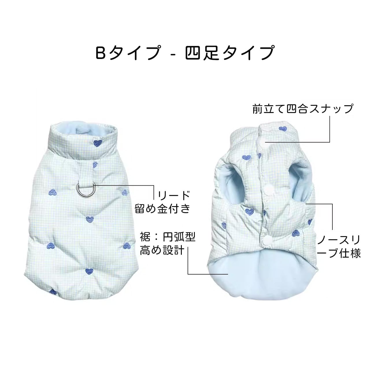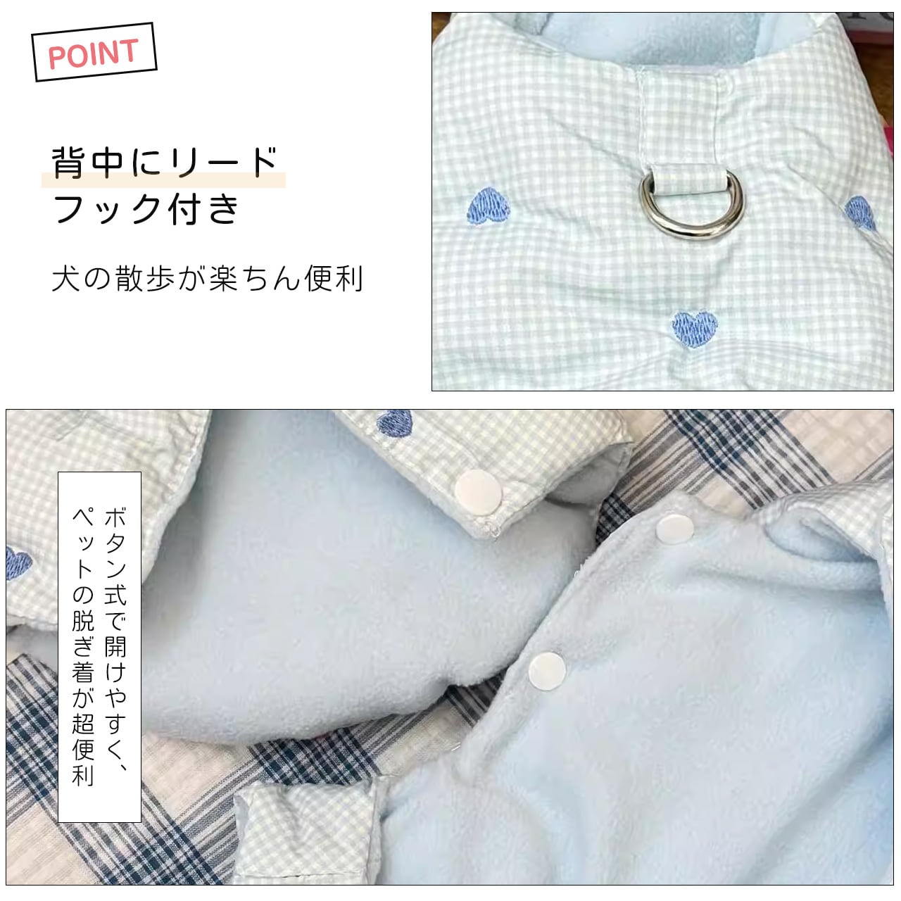 中小型犬の体型に合わせて設計し、豊かな厚手詰綿で強力な防寒保温効果を発揮し、外気の冷たさをしっかりブロックします。大人気のチェック柄にかわいいハート装飾を配し、可愛らしいデザインながら牽引ホックを内蔵し、散歩時に別のハーネスを着用する手間が省けます。二足タイプと四足タイプを選べ、室内防寒や外出散歩など様々なシーンに対応する、実用性と可愛さを両立したアイテムです。