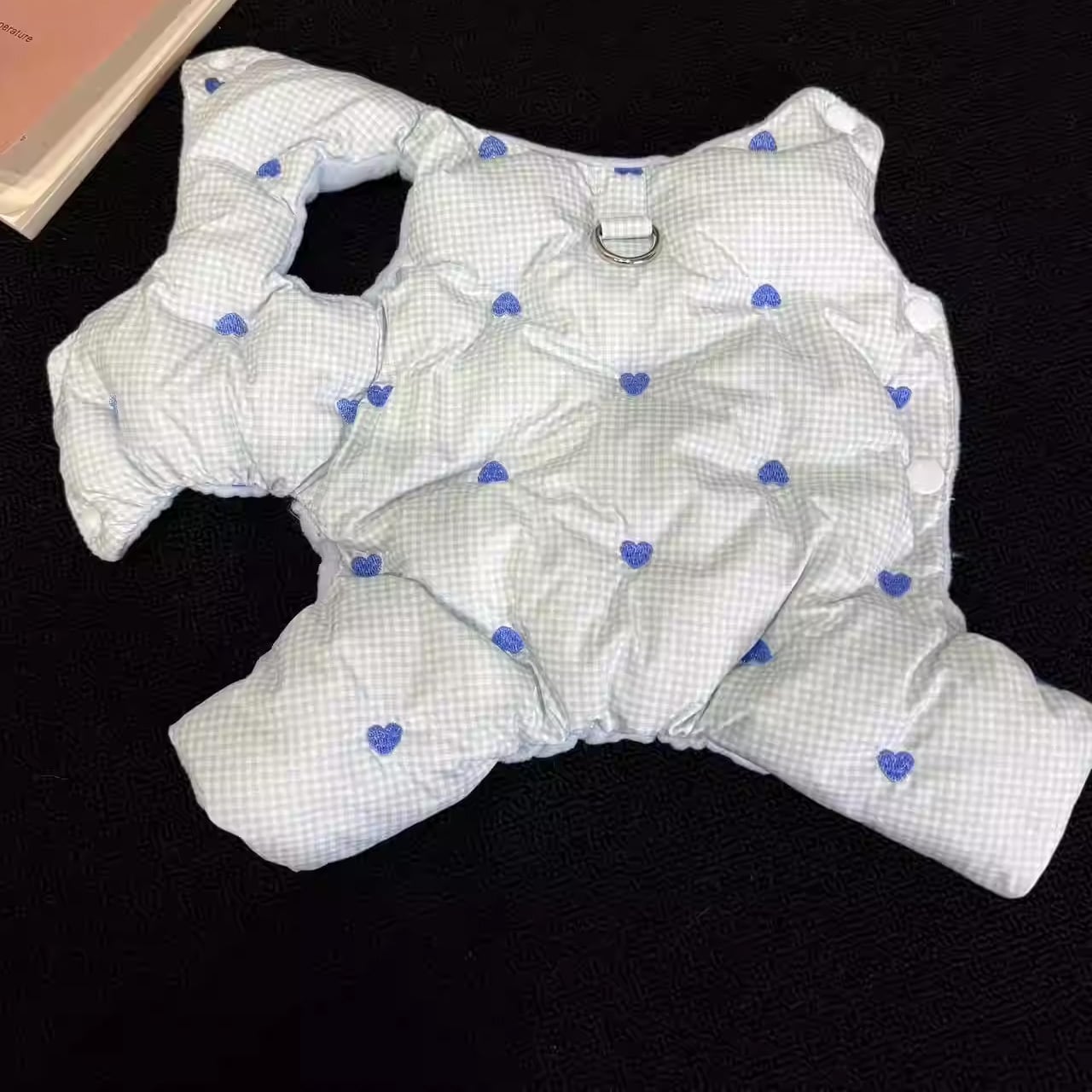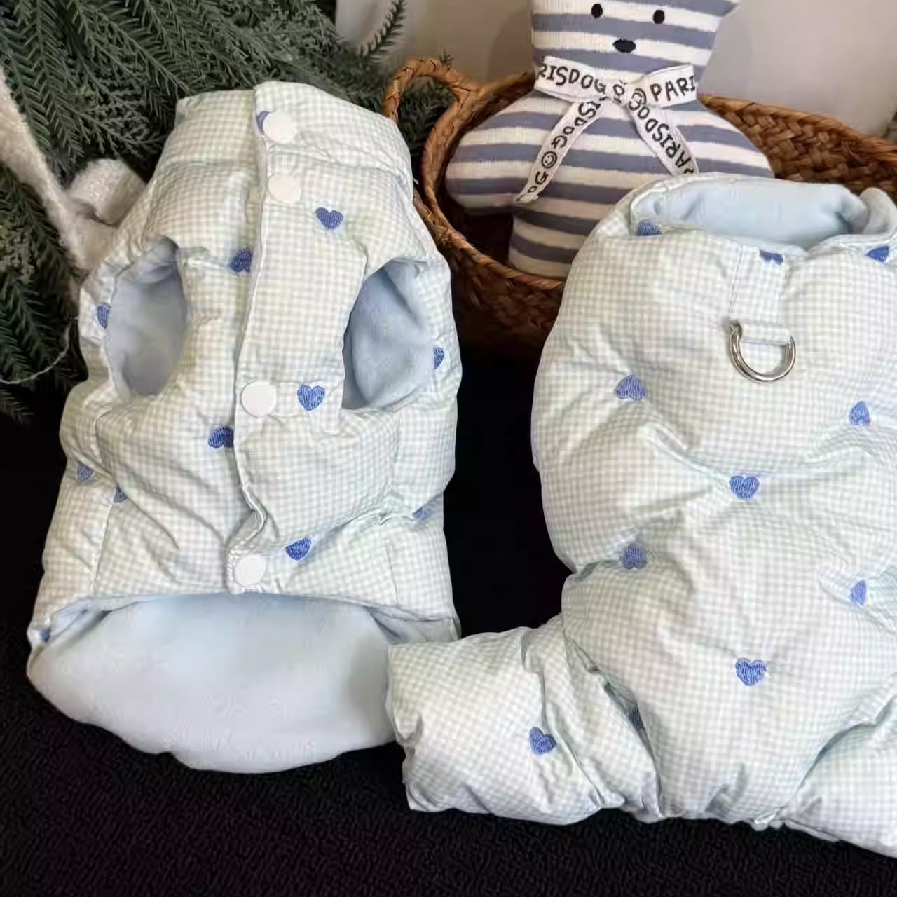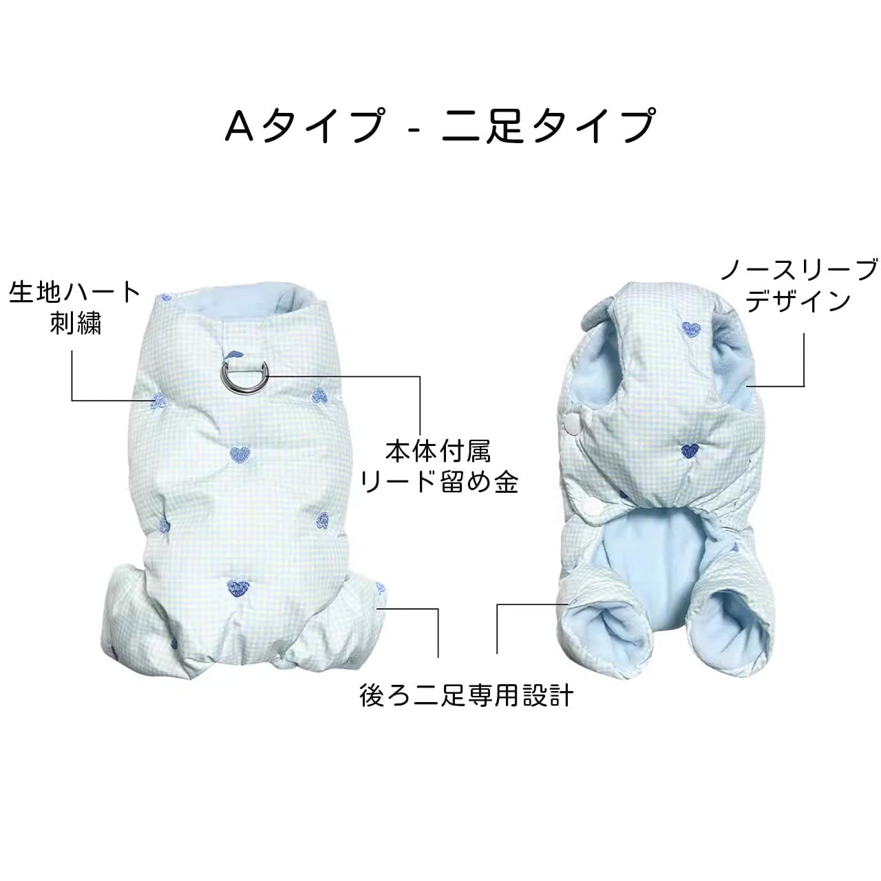 中小型犬の体型に合わせて設計し、豊かな厚手詰綿で強力な防寒保温効果を発揮し、外気の冷たさをしっかりブロックします。大人気のチェック柄にかわいいハート装飾を配し、可愛らしいデザインながら牽引ホックを内蔵し、散歩時に別のハーネスを着用する手間が省けます。二足タイプと四足タイプを選べ、室内防寒や外出散歩など様々なシーンに対応する、実用性と可愛さを両立したアイテムです。