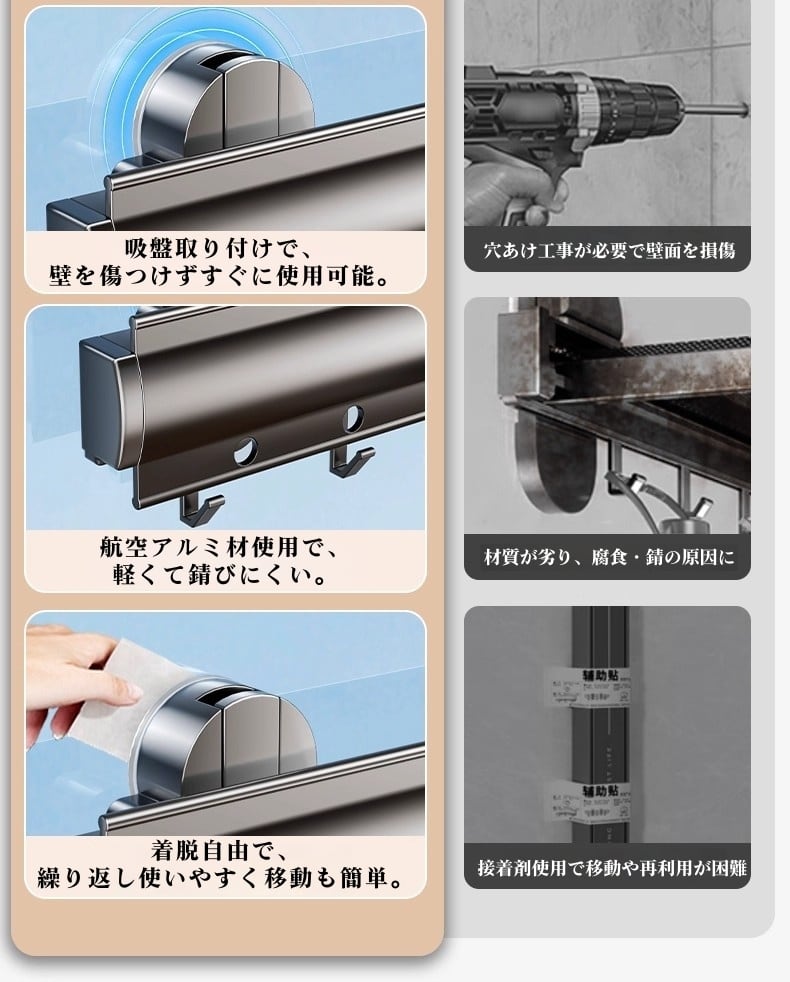 ※ 取り付け面は、平坦で滑らかで清潔な面(タイル、ガラス、平滑な塗装壁面など)をご選択ください。凹凸のある壁やザラついた壁、クロス壁では十分な吸着力が得られない場合があります。