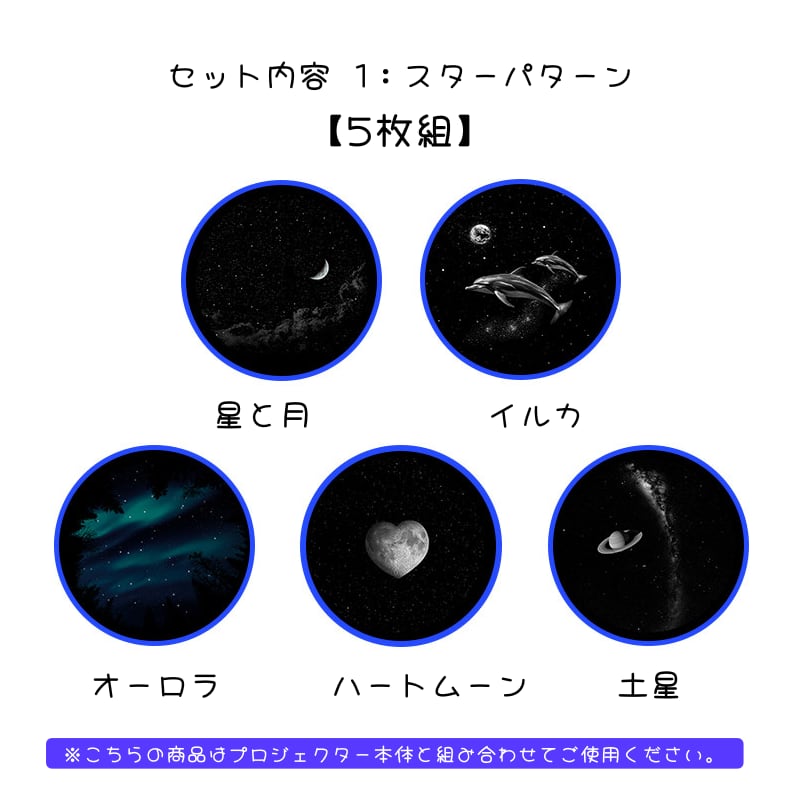 セット1(スターパターン5枚組):星月、イルカ、オーロラ、ハートムーン、土星