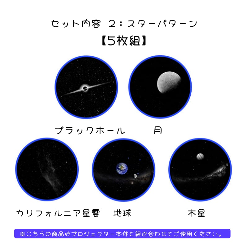 セット2(ギャラクシーパターン5枚組):ブラックホール、月、カリフォルニア星雲、地球、木星