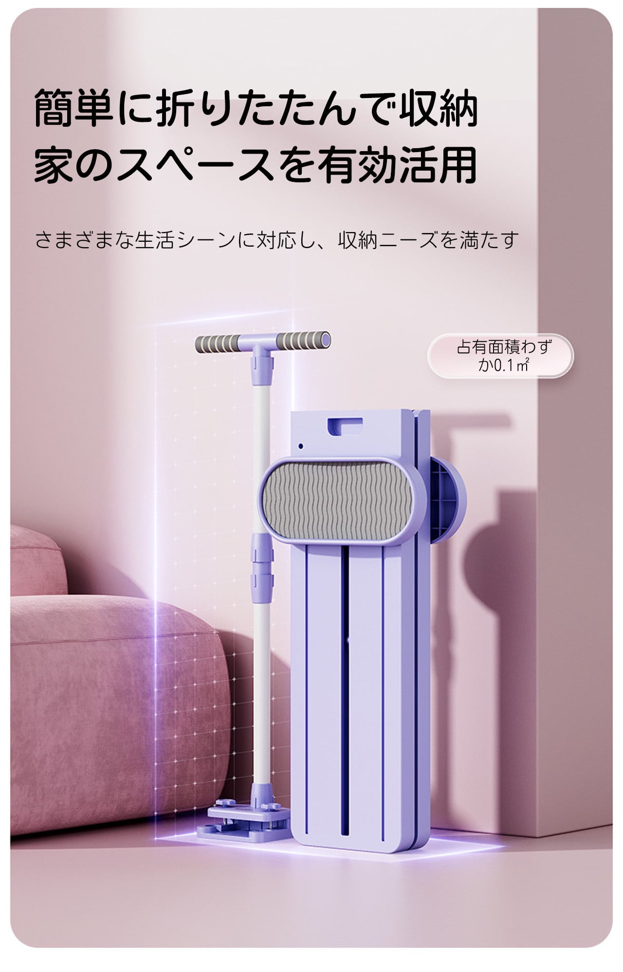 使用しないときはコンパクトに折りたたんで収納可能。占有面積はわずか0.1㎡。狭い日本のご家庭でもストレスなく置けます。