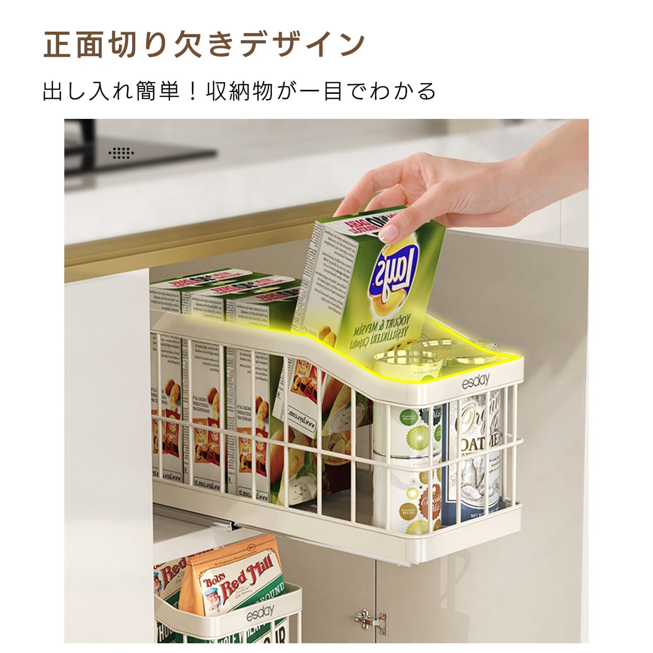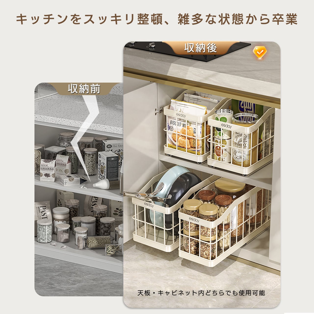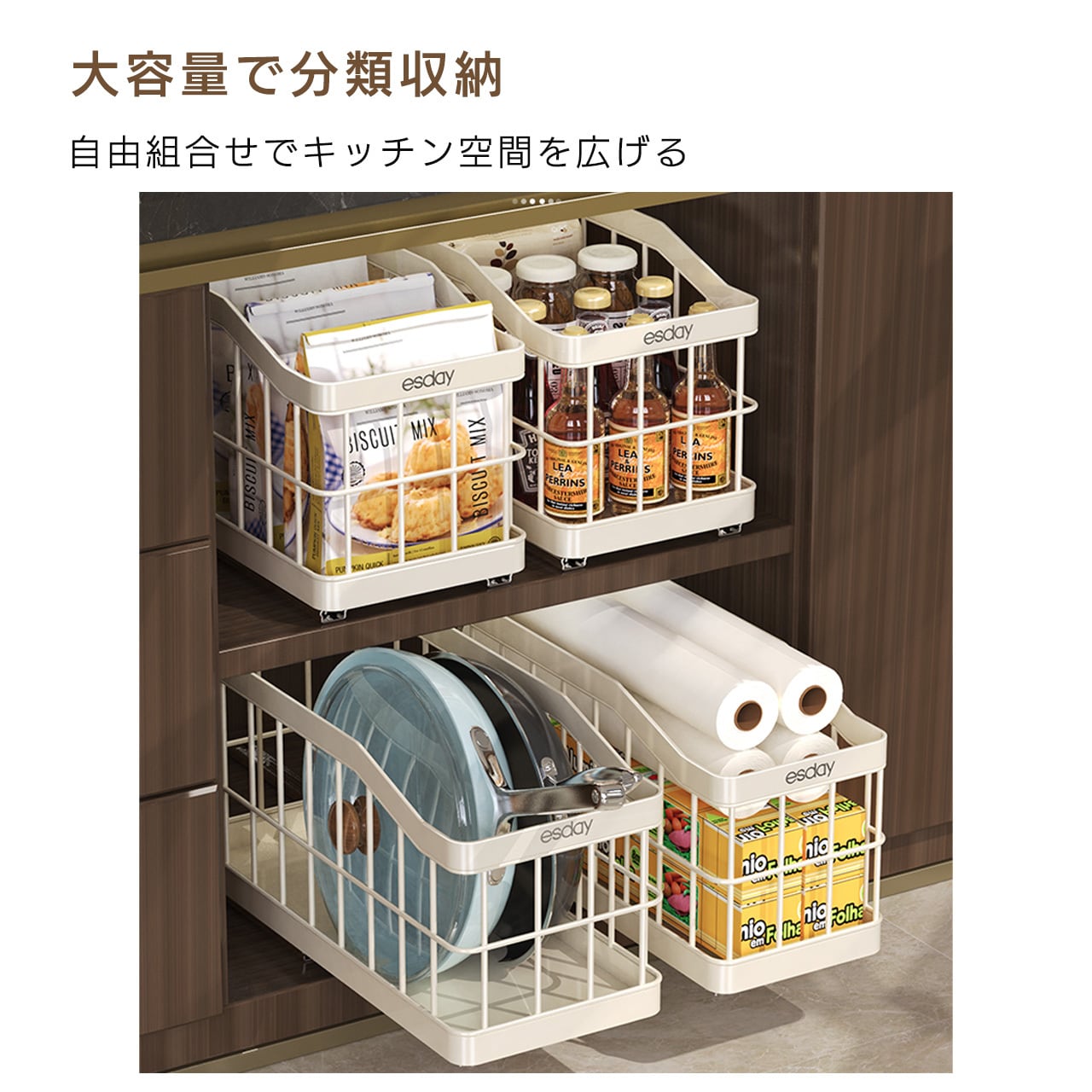 分類収納でキッチンをスッキリさせ、深いキャビネットの奥まで手軽にアクセスできる、便利な収納アイテムです。