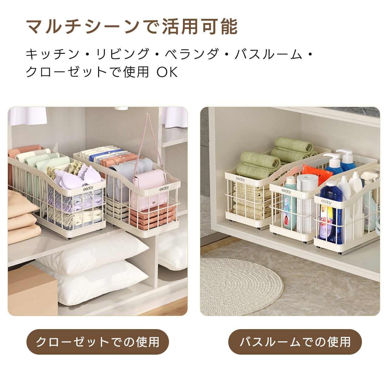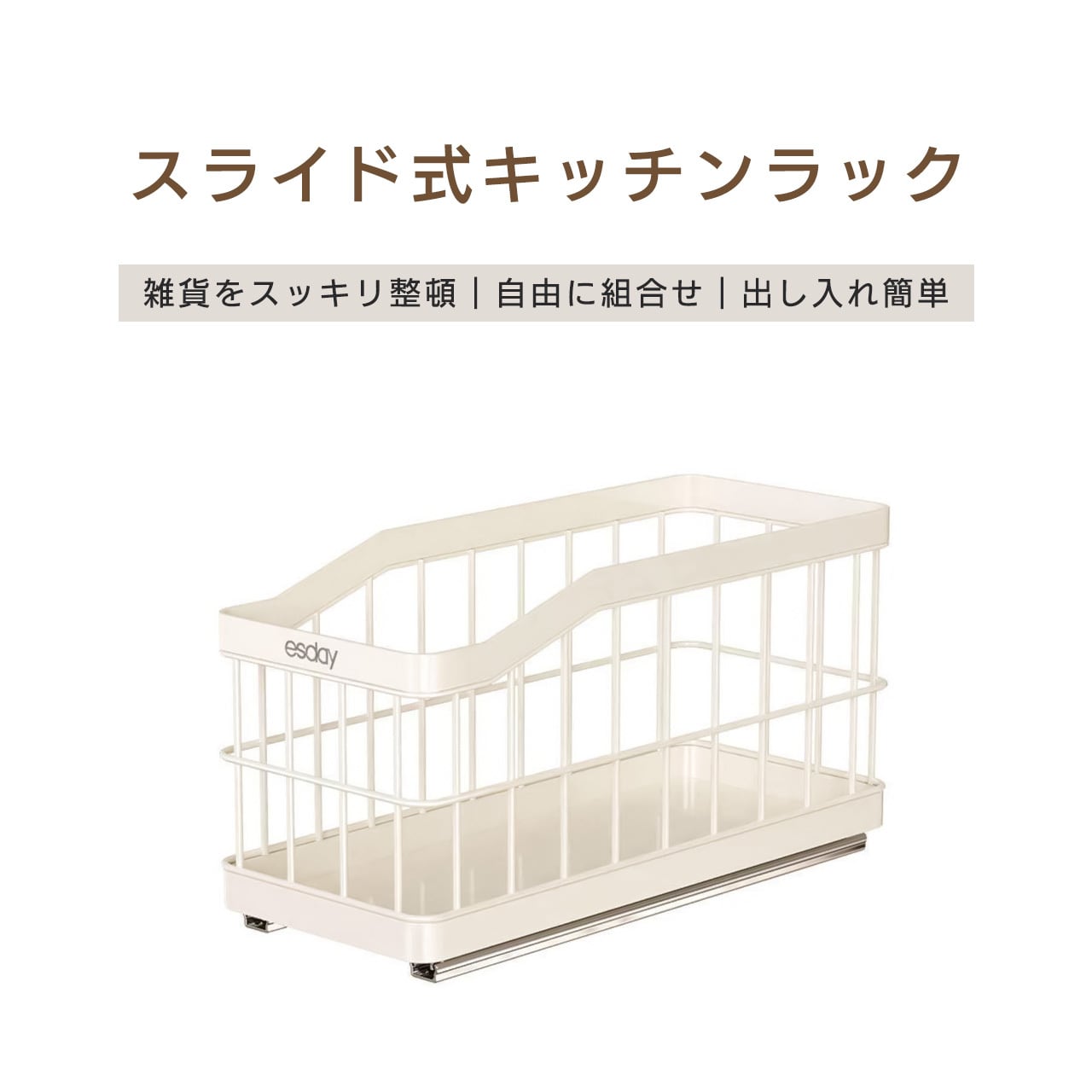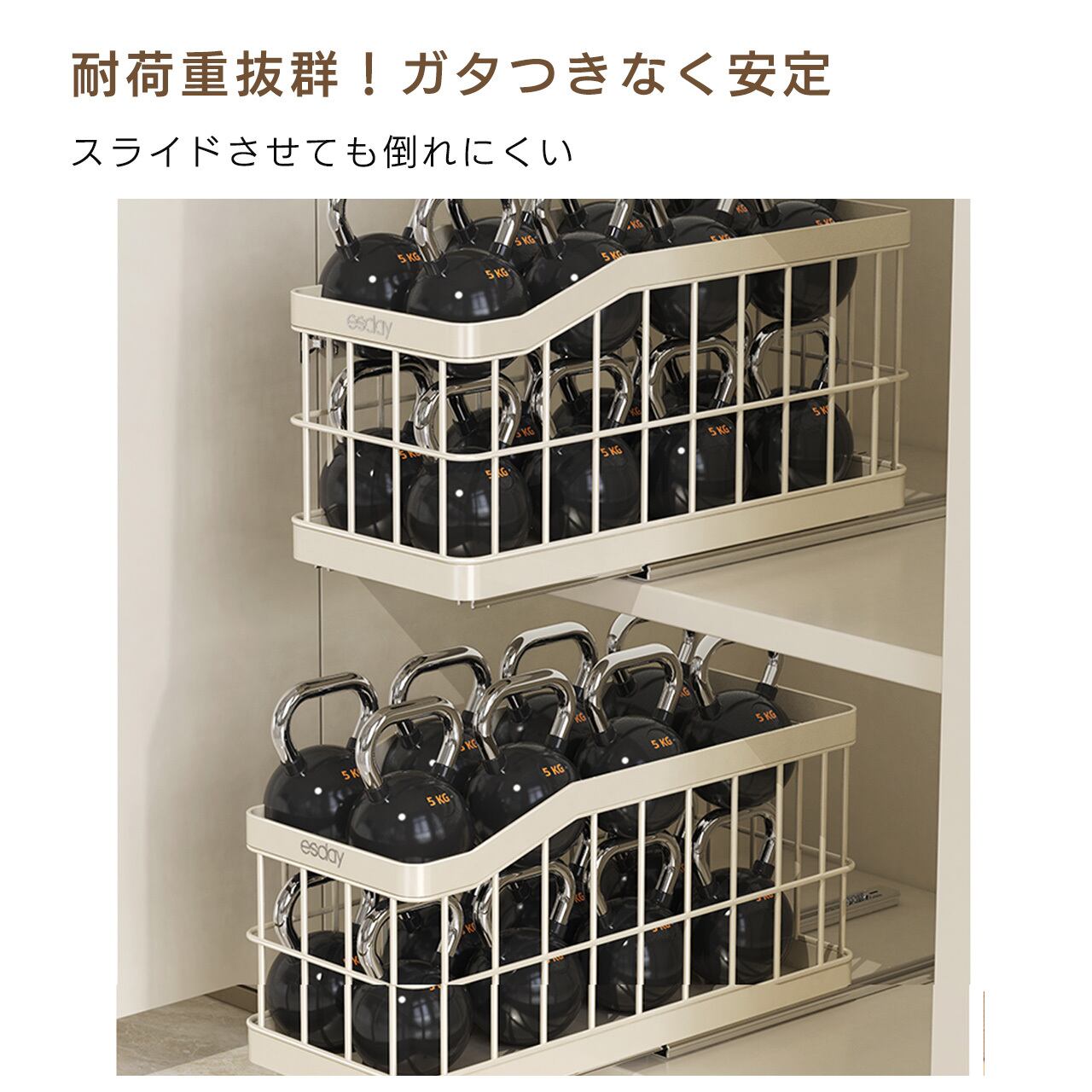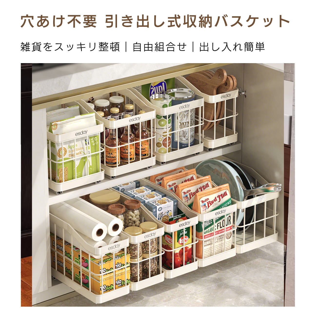 分類収納でキッチンをスッキリさせ、深いキャビネットの奥まで手軽にアクセスできる、便利な収納アイテムです。