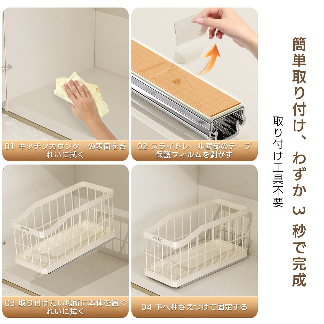 スチールボール入りの静音スライドレールがスムーズな引き出しを実現し、強力ナノテープでキャビネットにしっかり固定。