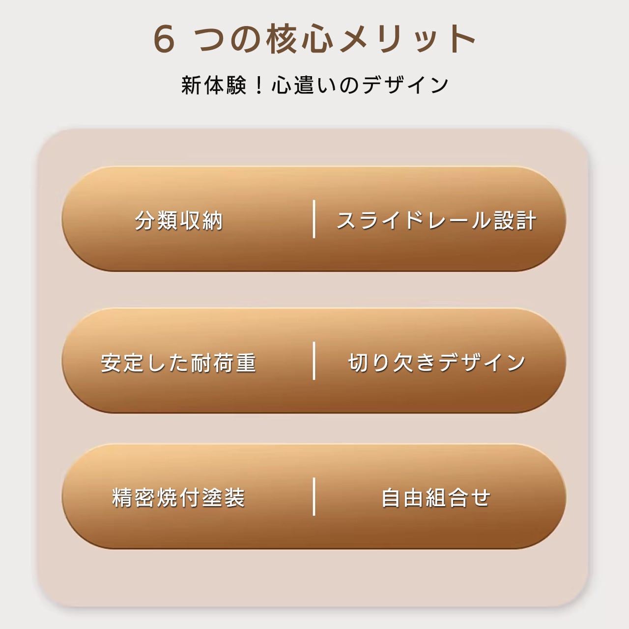 頑丈なフレーム構造で、重さに耐える設計。調味料の瓶や調理器具をたくさん入れても、変形しにくく長く愛用できます。