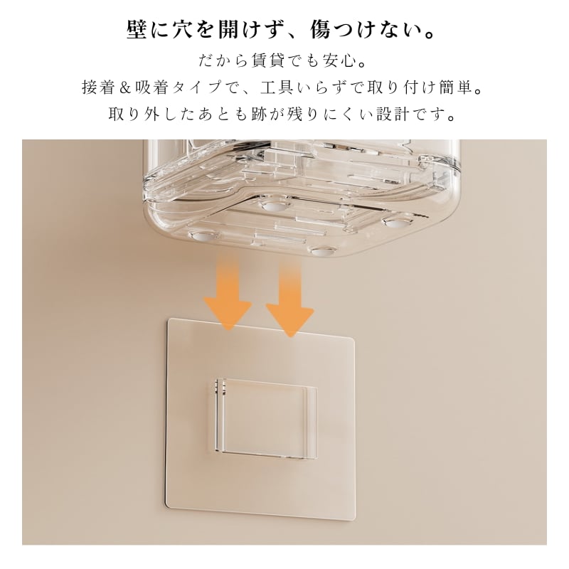 お使いの環境に合わせて、壁に掛けても、洗面台に置いても使えます。付属の接着シールを使えば、工具いらずで簡単取り付け。賃貸でも安心です。