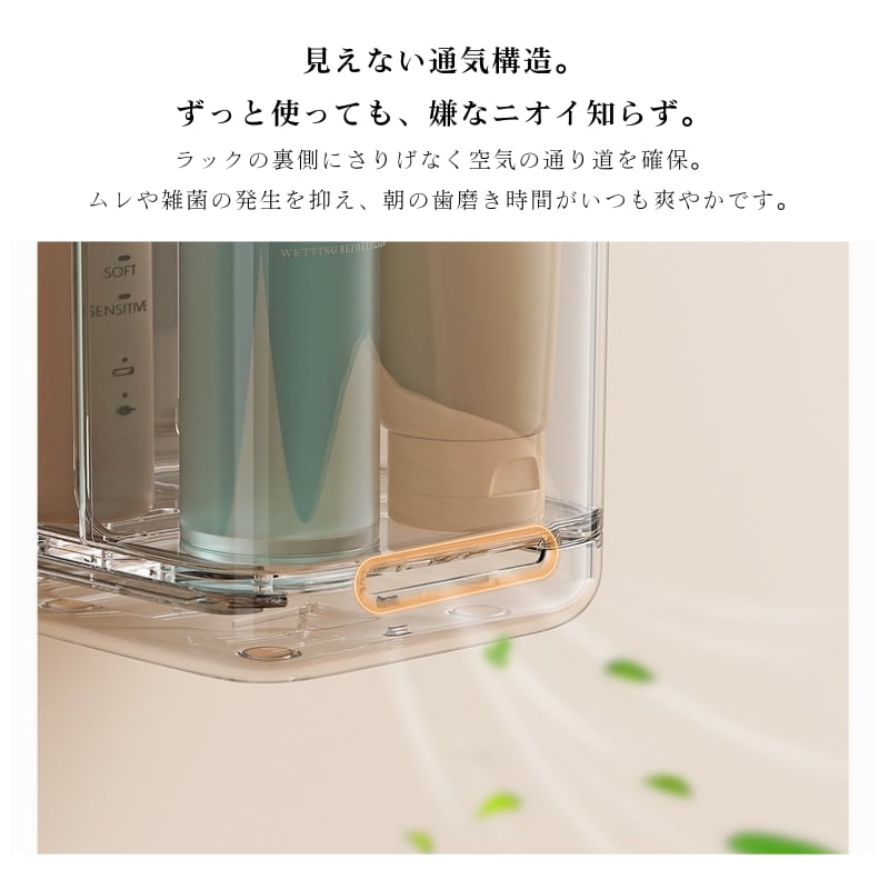 ラックの裏側には空気の通り道を確保。湿気がこもりにくく、雑菌の繁殖を防ぎます。