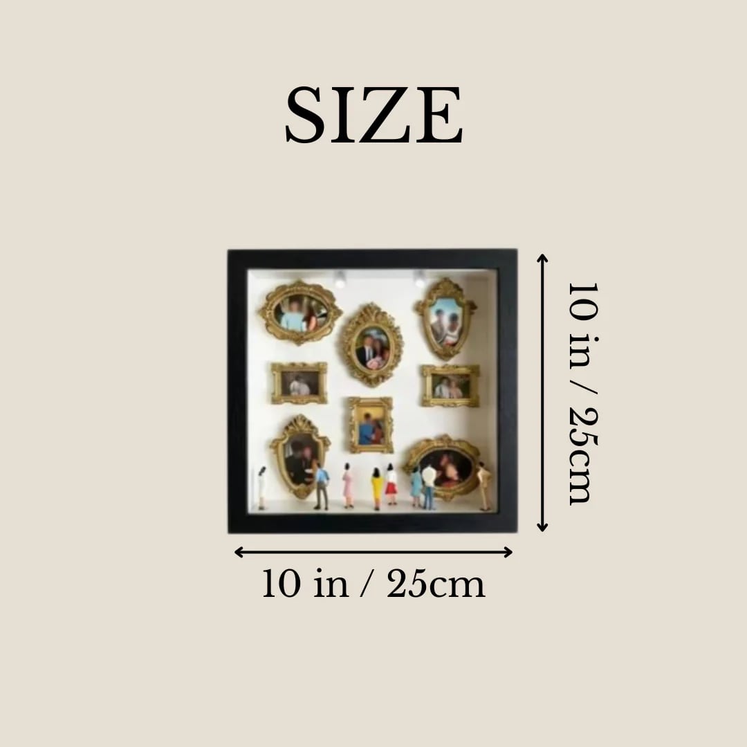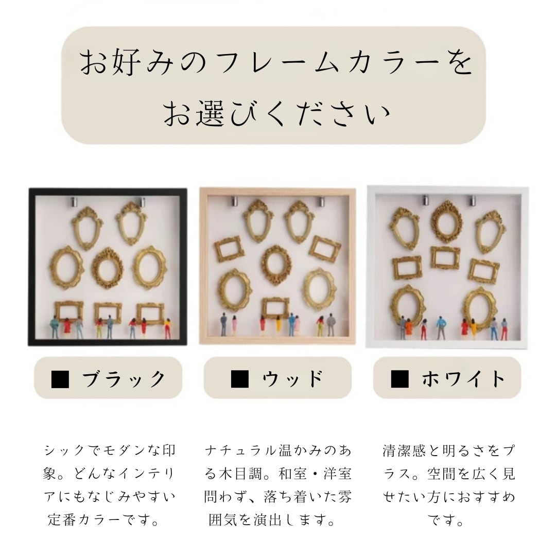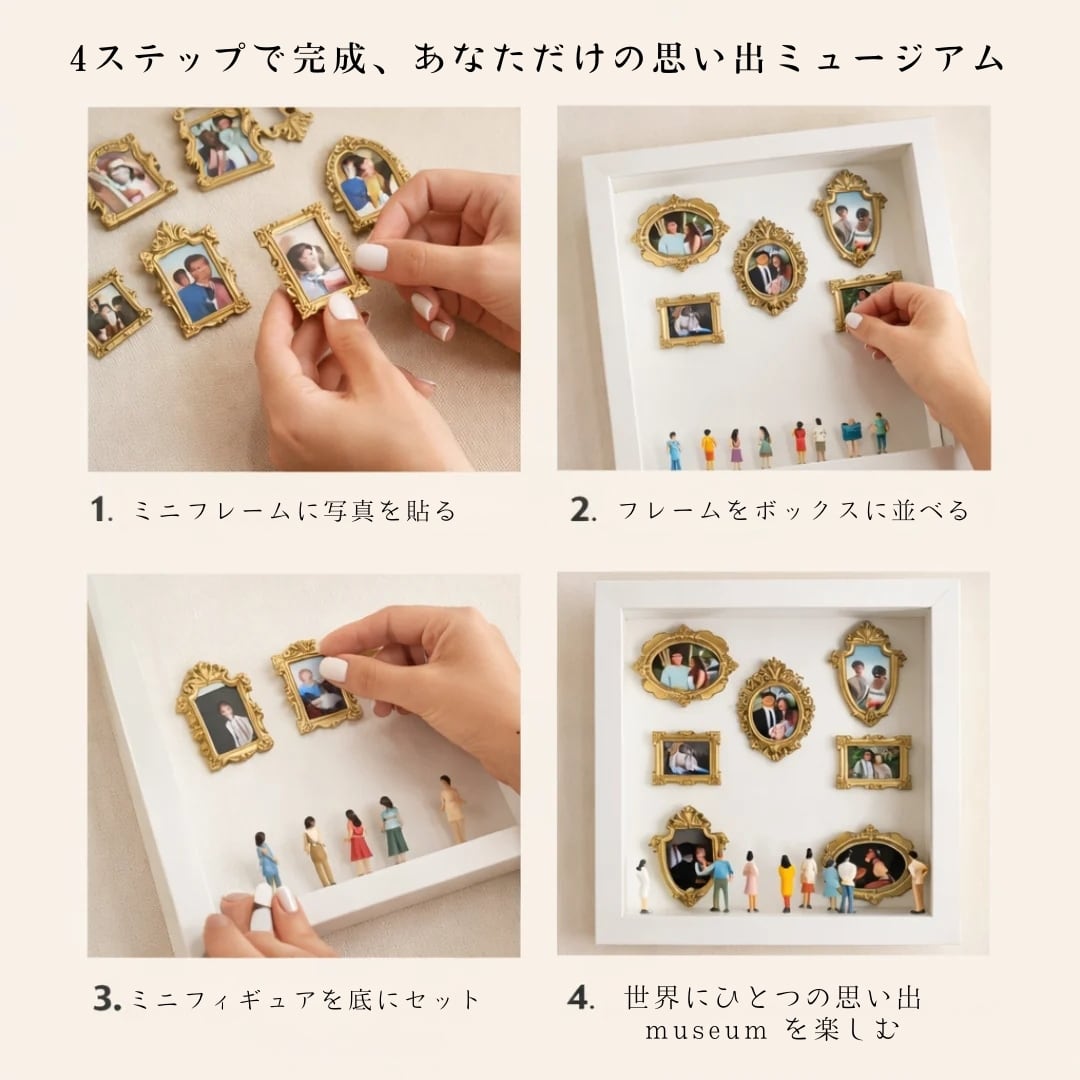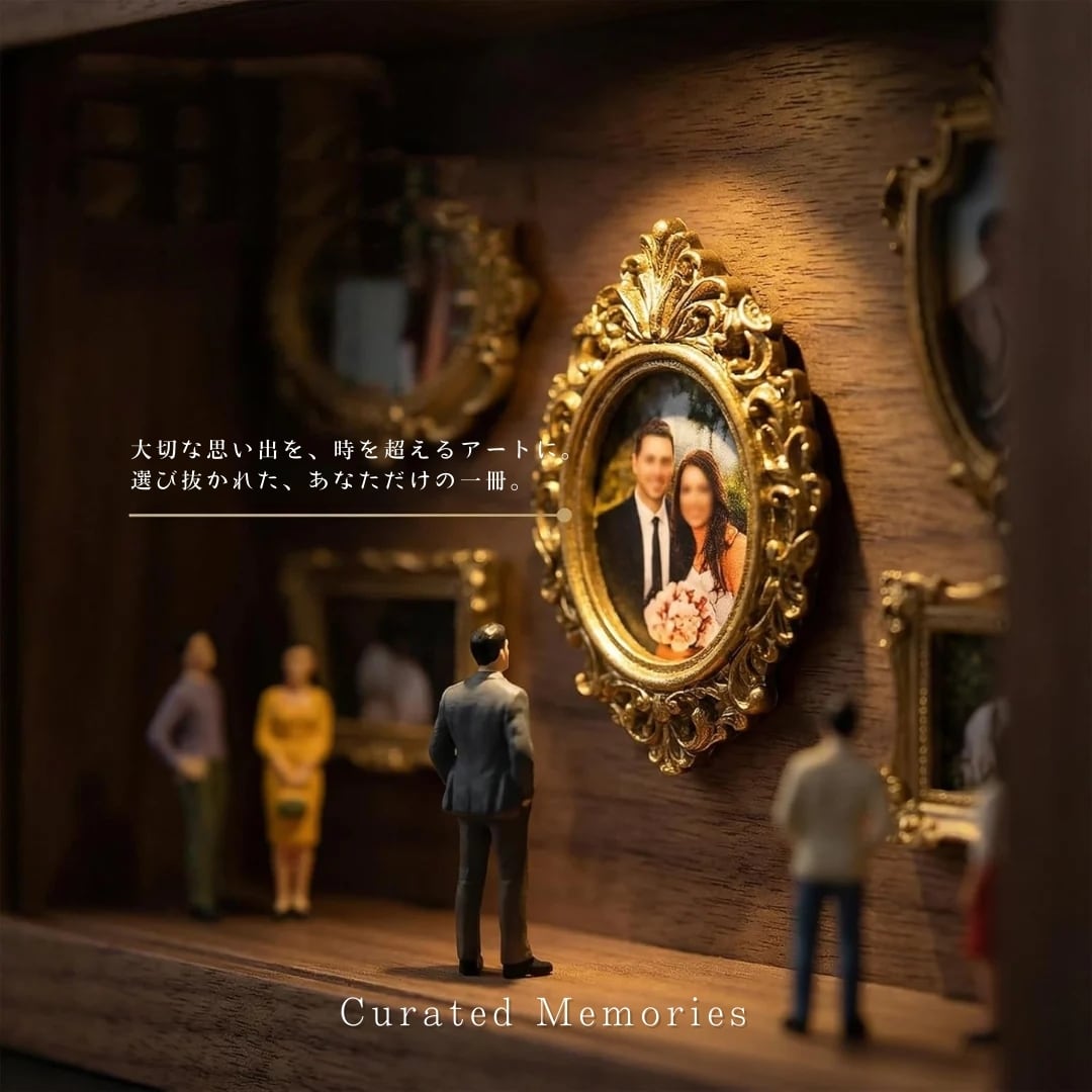 ただ写真を貼るだけではありません。ミニチュアの観客たちがあなたの思い出を見守る、まるで本物の美術館のような情景が完成します。 旅先の風景、家族の笑顔、二人の記念日…。厳選されたクラシカルなゴールドのミニフレームと、愛らしいフィギュアが、何気ない日常にドラマチックなストーリーを添えます。