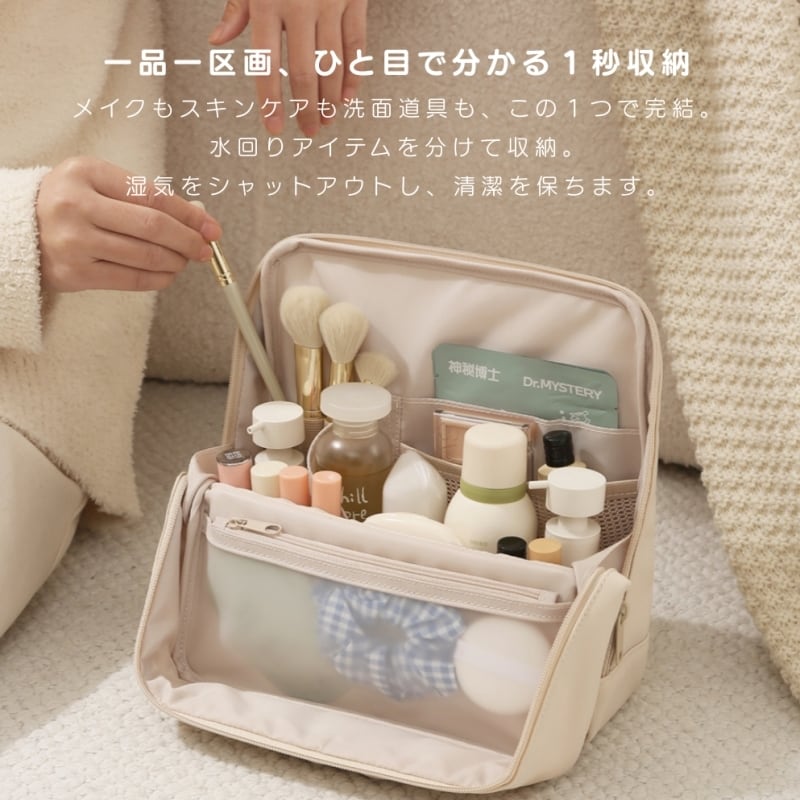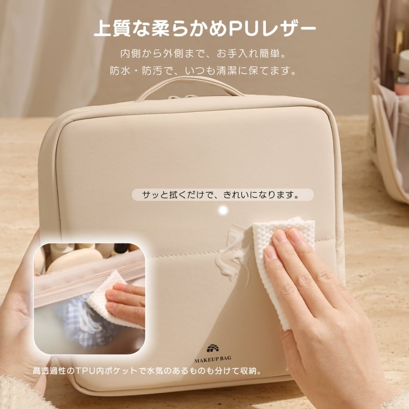 水回りアイテムを分けて収納できるTPU内ポケット付き。湿気や漏れを気にせず、バッグ内を清潔に保ちます。