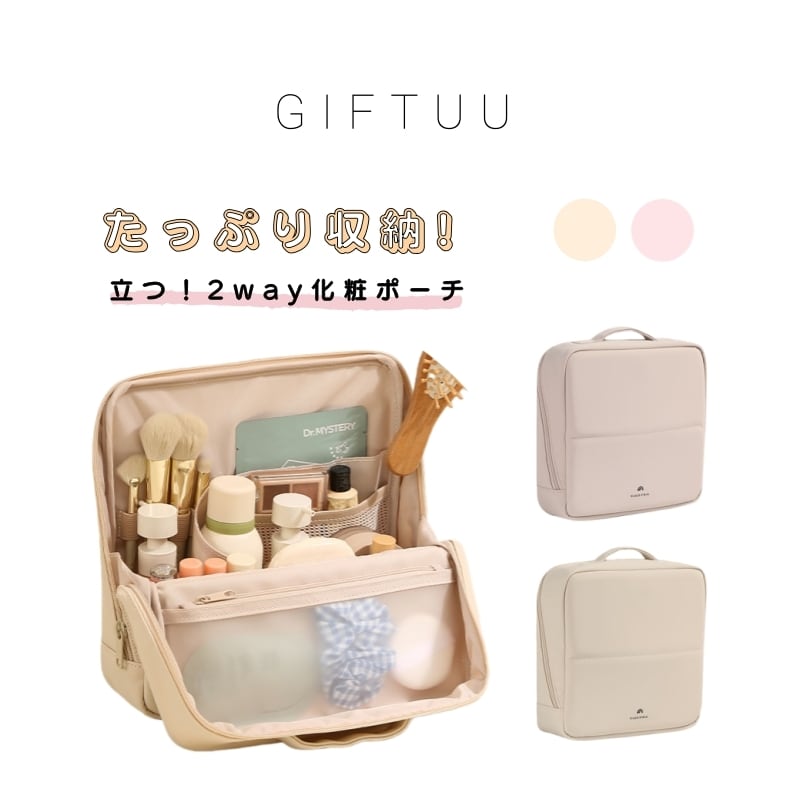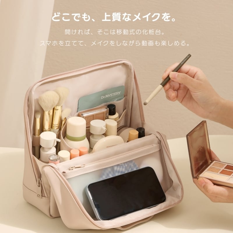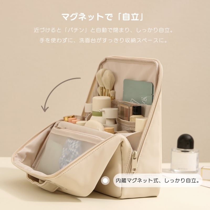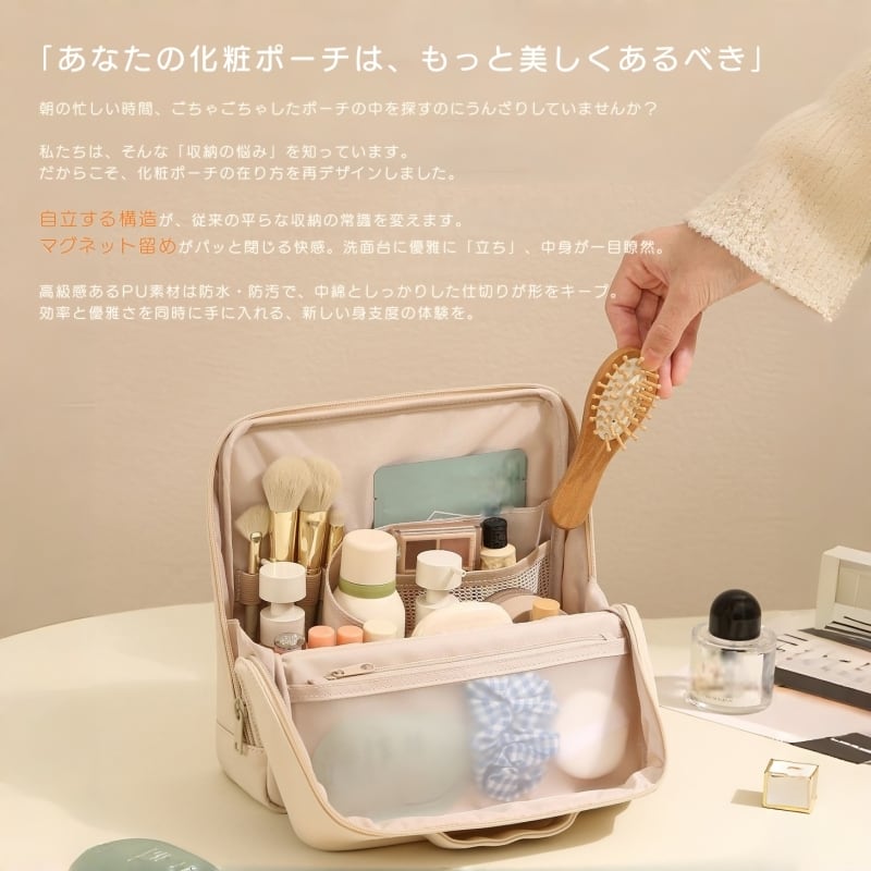✨「自立する美しさ」で、朝の身支度が時短に。上質なPUレザーのスタンディング化粧ポーチ