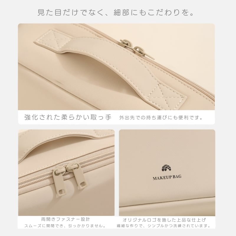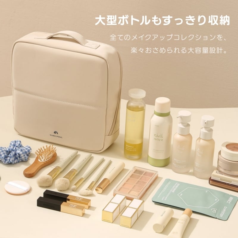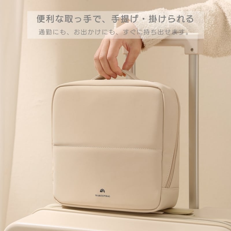 コンパクトながら大容量で高瓶も収納。便利な取っ手で手提げ・掛けられ両用。ホテルでも自宅でも、あなたの美を完璧にサポート。