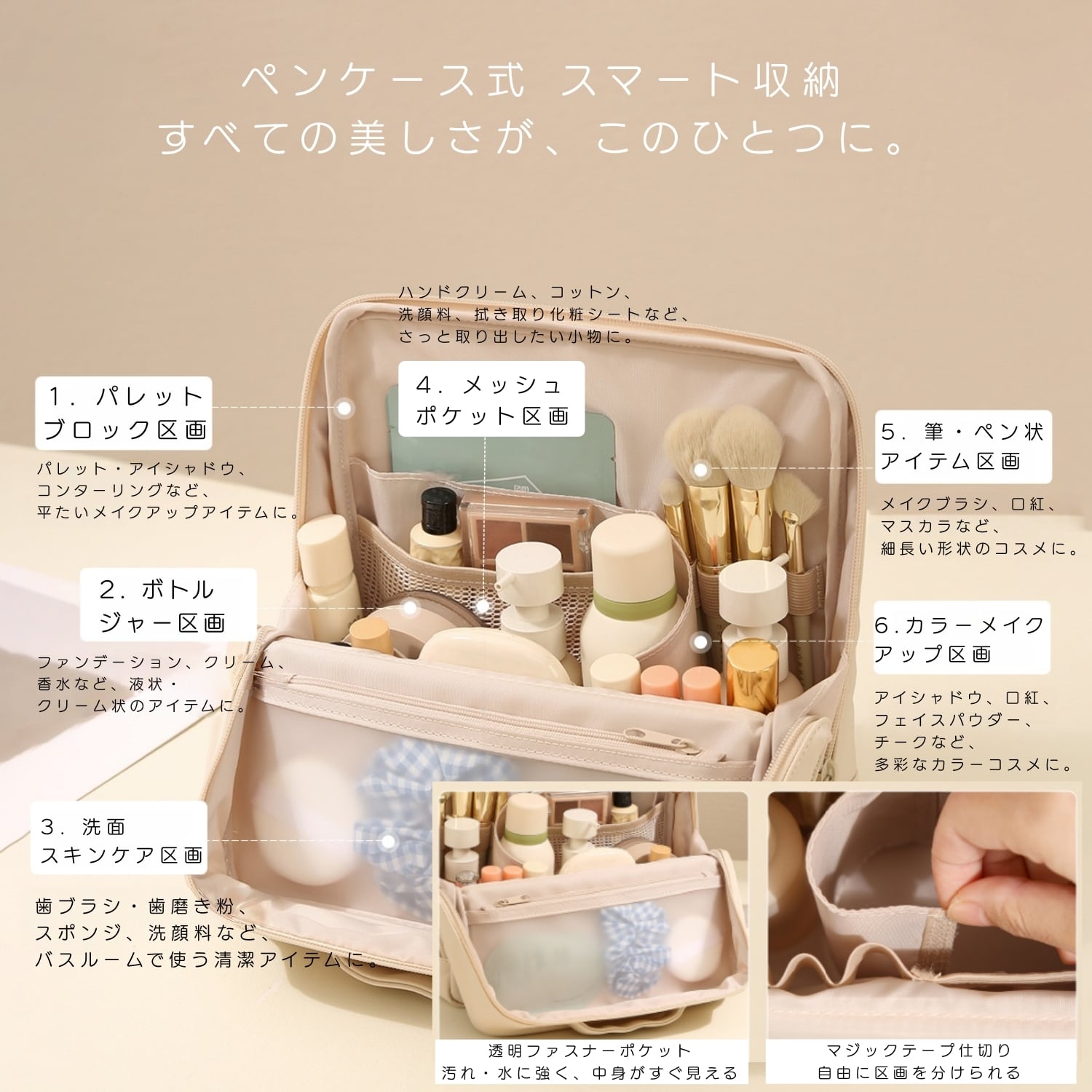 ペンケース式の6つの区画(パレット・ボトル・筆・化粧品・洗面・メッシュ)で、すべてのアイテムが定位置に。探す時間をゼロに。