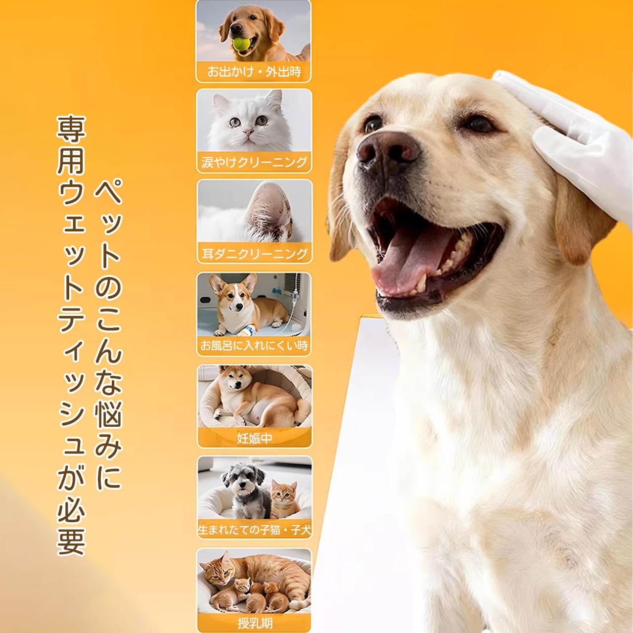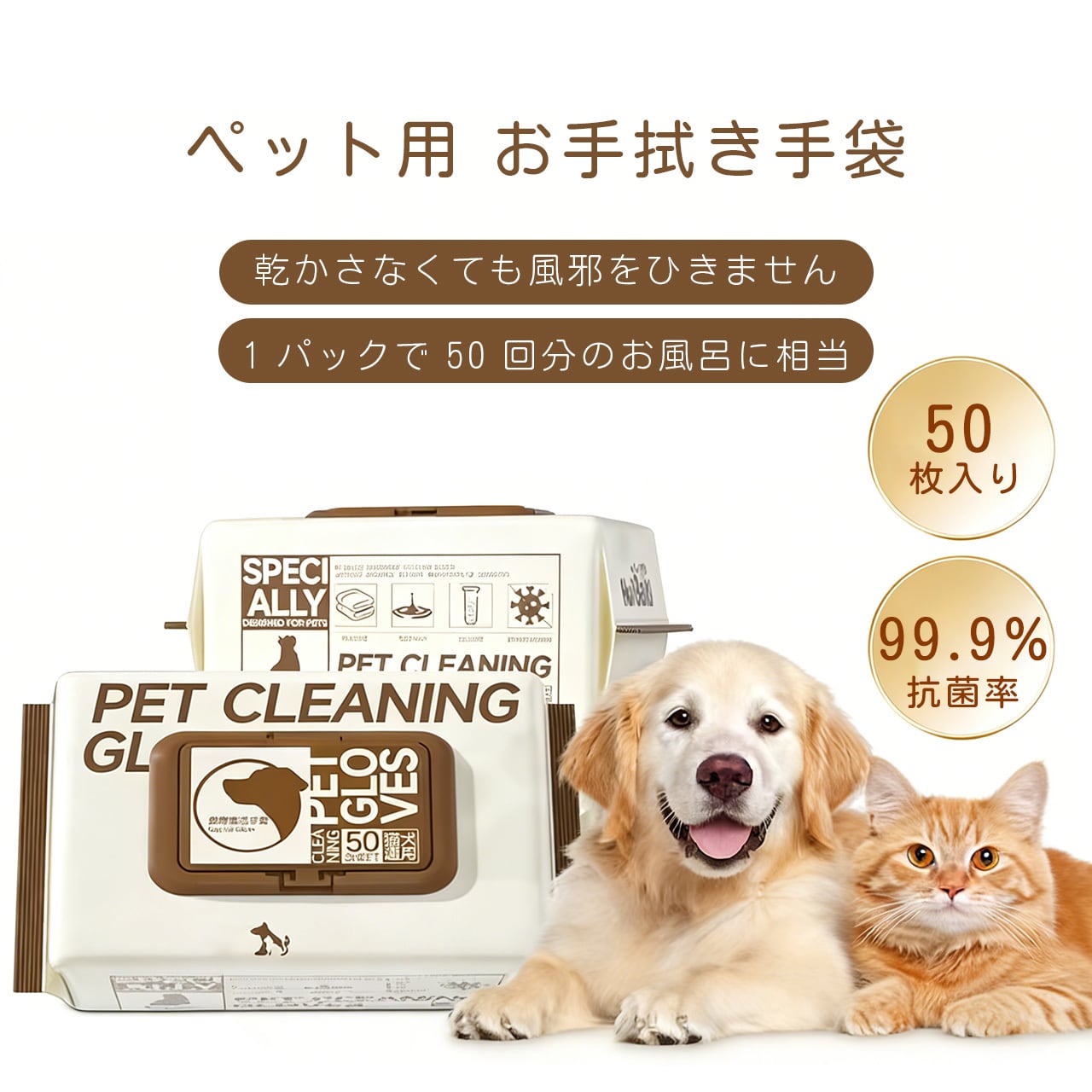 水を使わずに一瞬でペットの汚れを落とし、99.9% の高い除菌効果で安心の清潔感を提供します。厚手の不織布素材がしっかり汚れを絡め取り、植物由来の優しい成分がペットの肌を守ります。