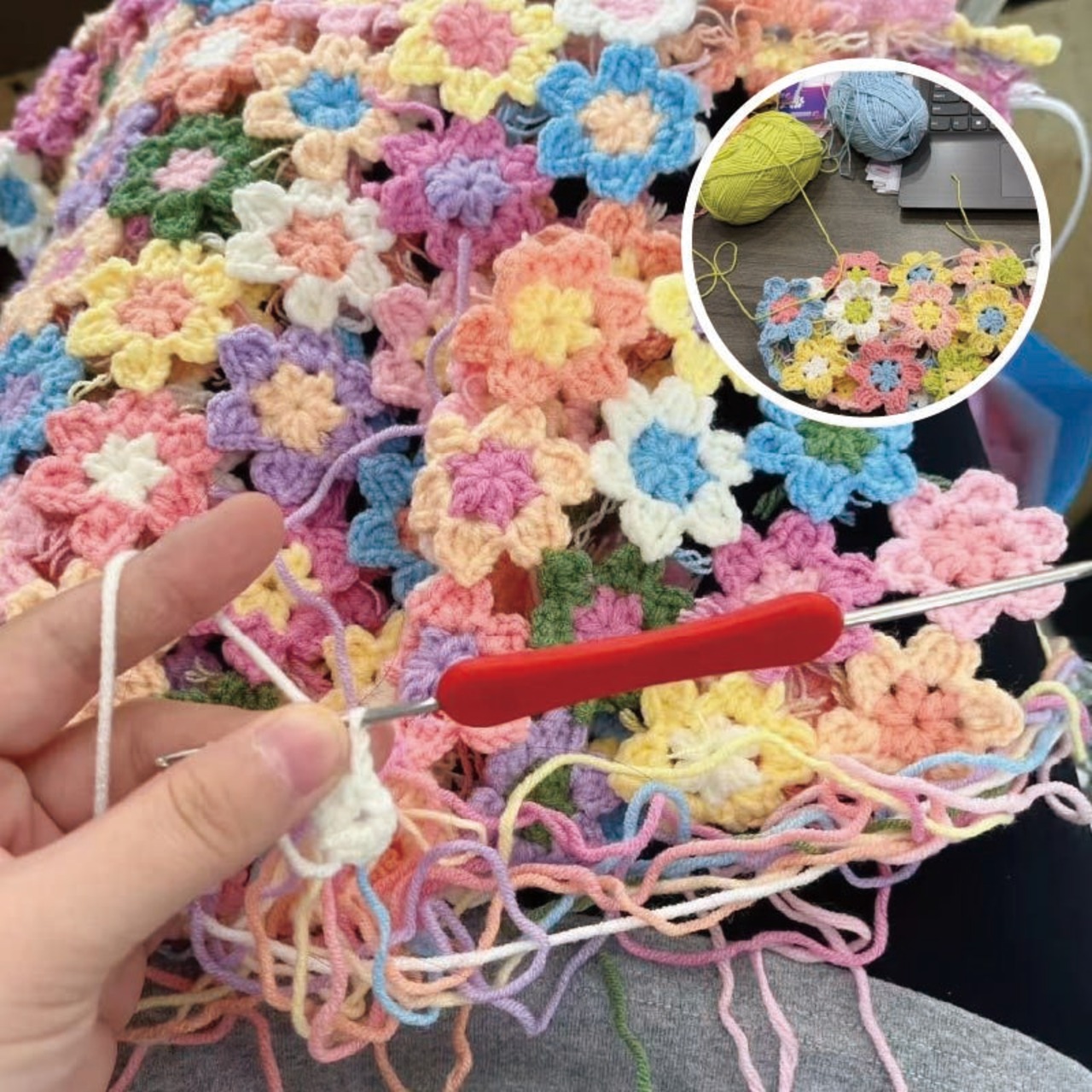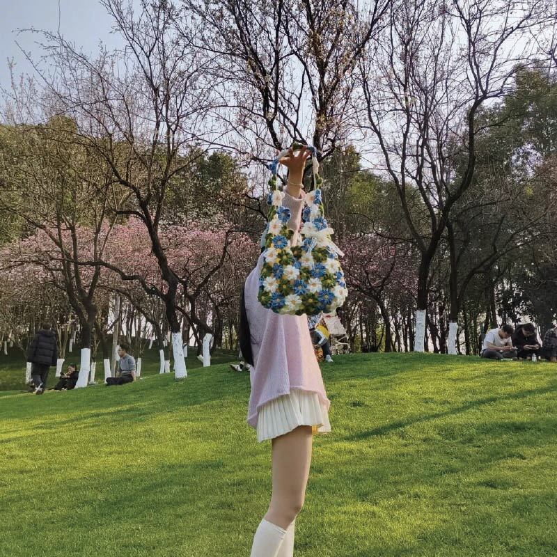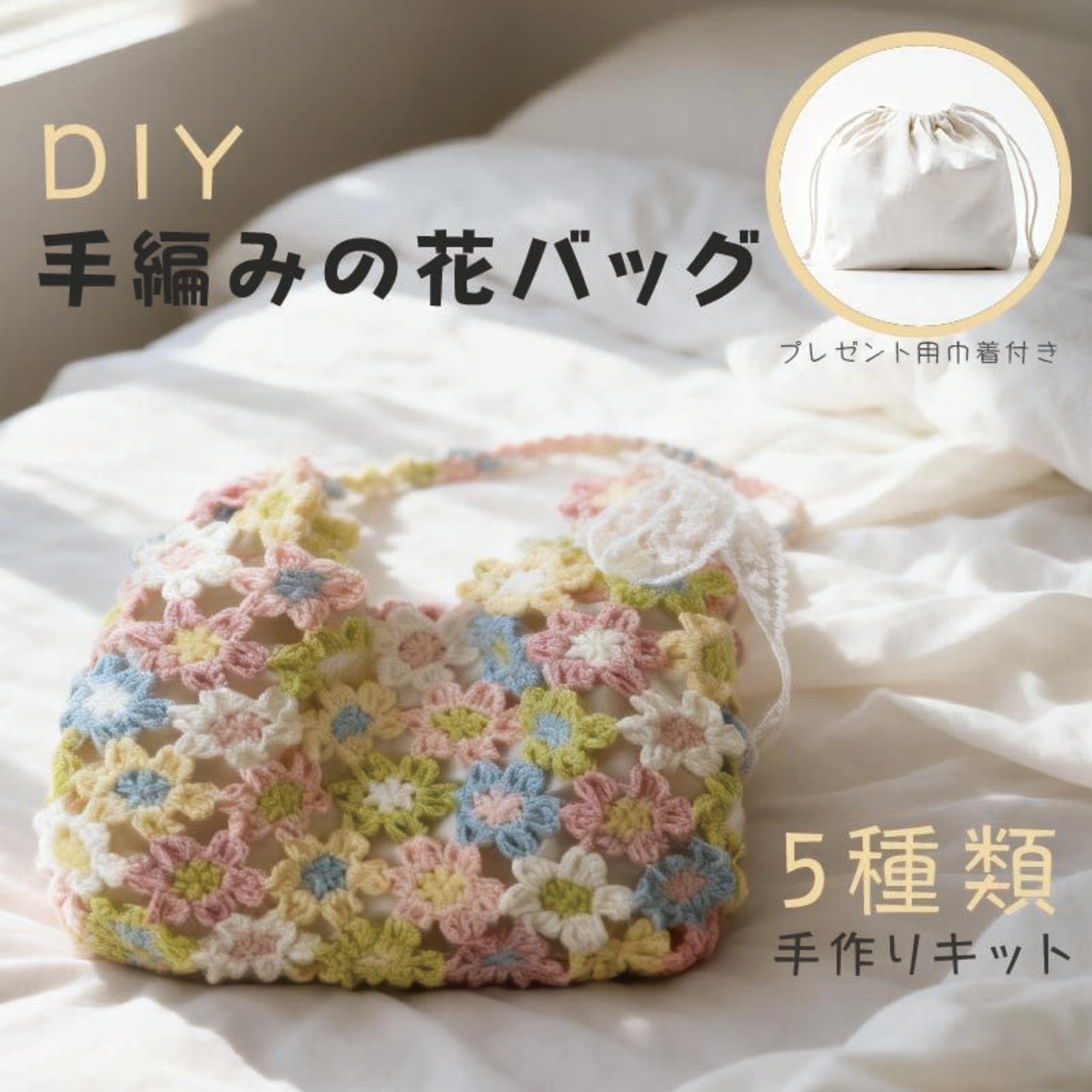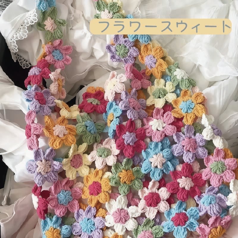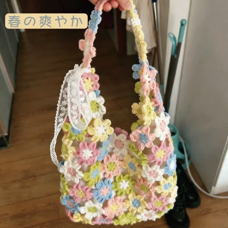 手編みの花が咲く、かわいい花バッグの制作キットです。