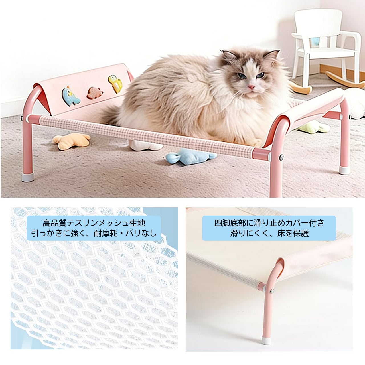 安全設計で、飛び跳ねても安心、長く使えるペットベッド。