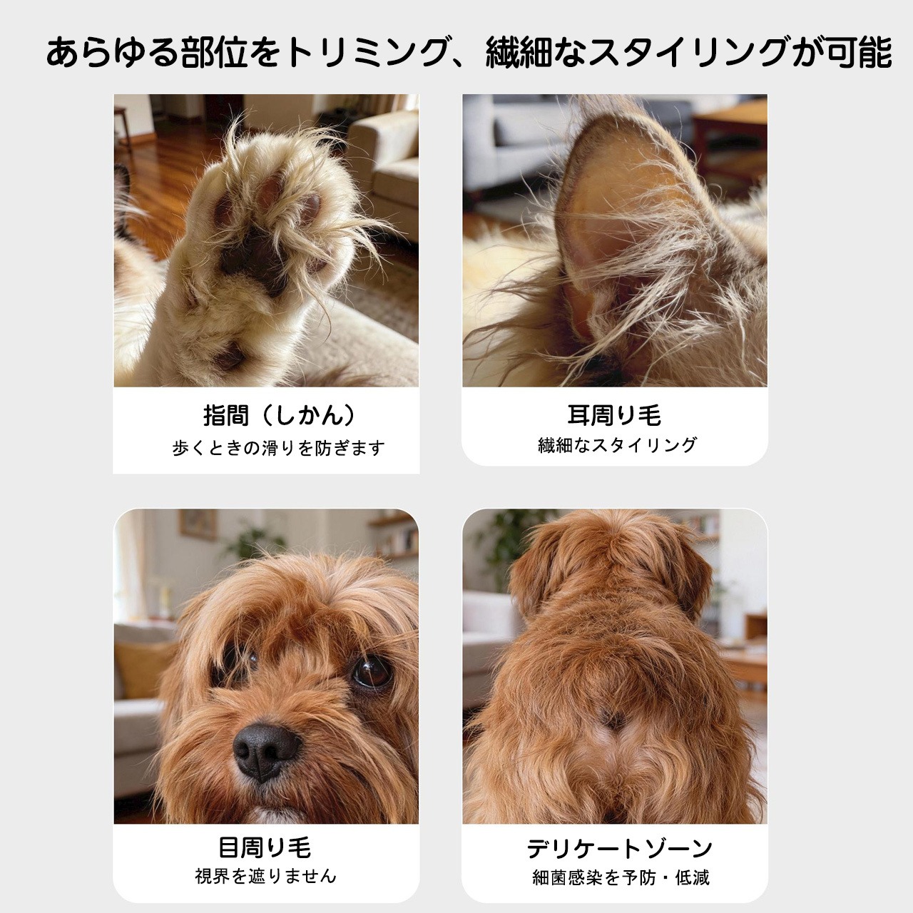 - 🐶 犬のトリミング:小型犬(チワワ、テディ、ポメラニアンなど)の足裏毛、肛門周り、顔周り、お腹の毛などの局部トリミングに。大型犬の細かい部位の補修トリミングにも適しています。