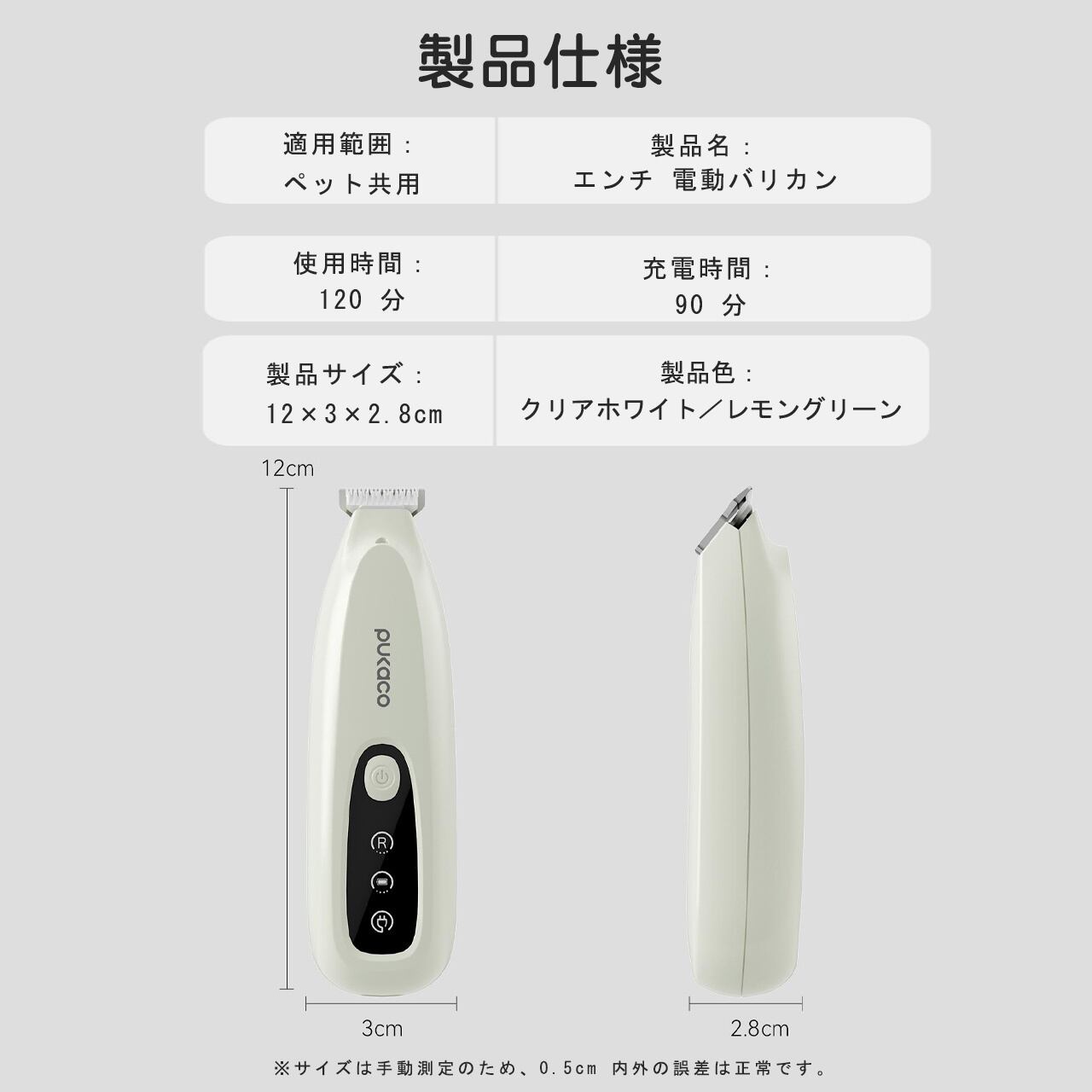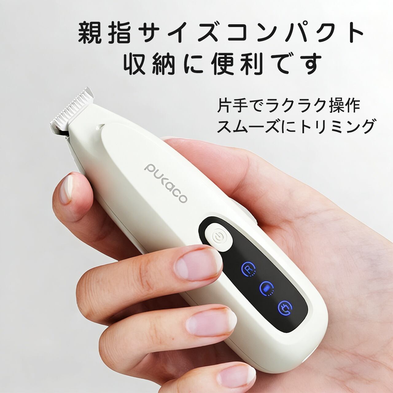 12×3×2.8cm のミニサイズで、手のひらに収まる親指サイズ。細かい部位のトリミングに最適で、猫の足裏毛、犬の肛門周り、お腹の毛など、従来の大型バリカンでは難しかった細部まで簡単にカットできます。