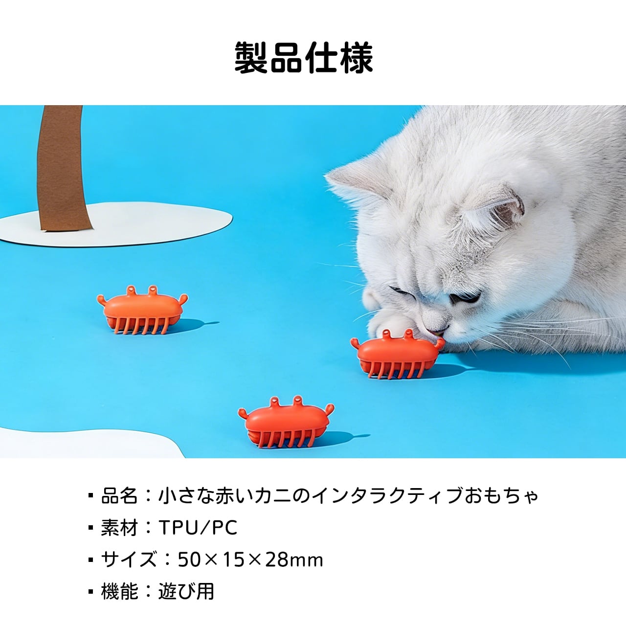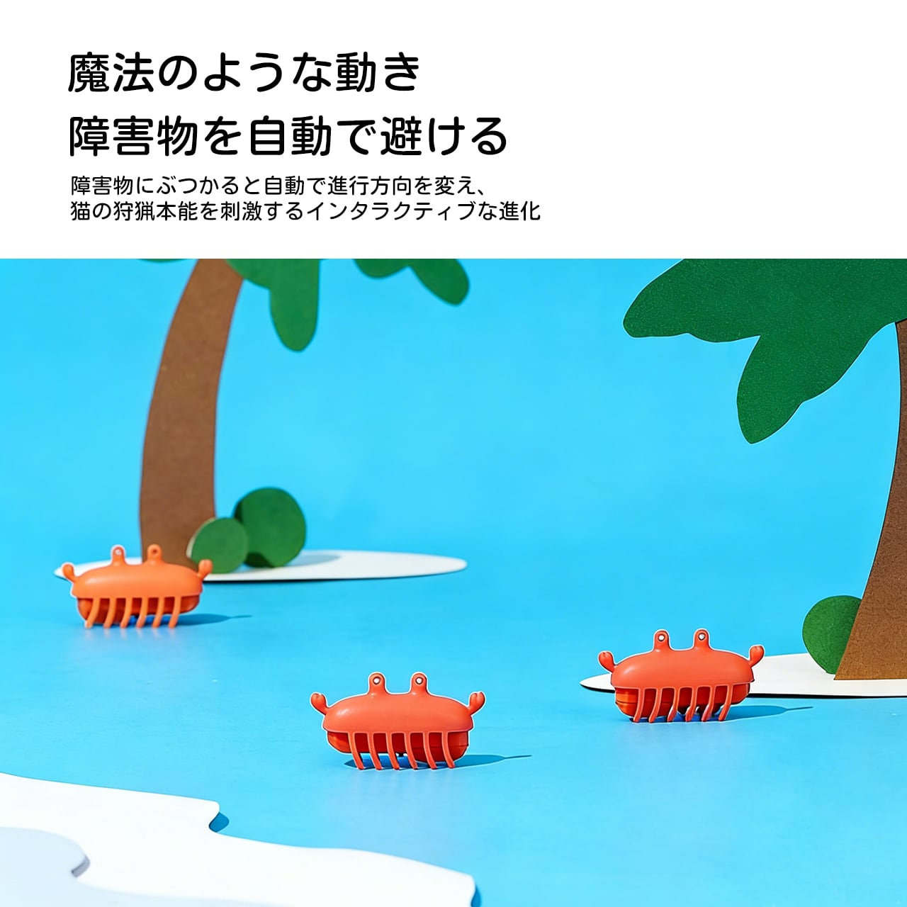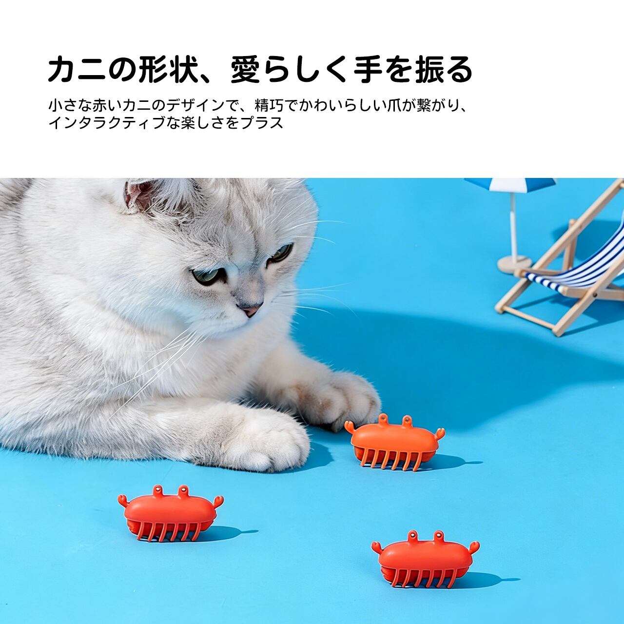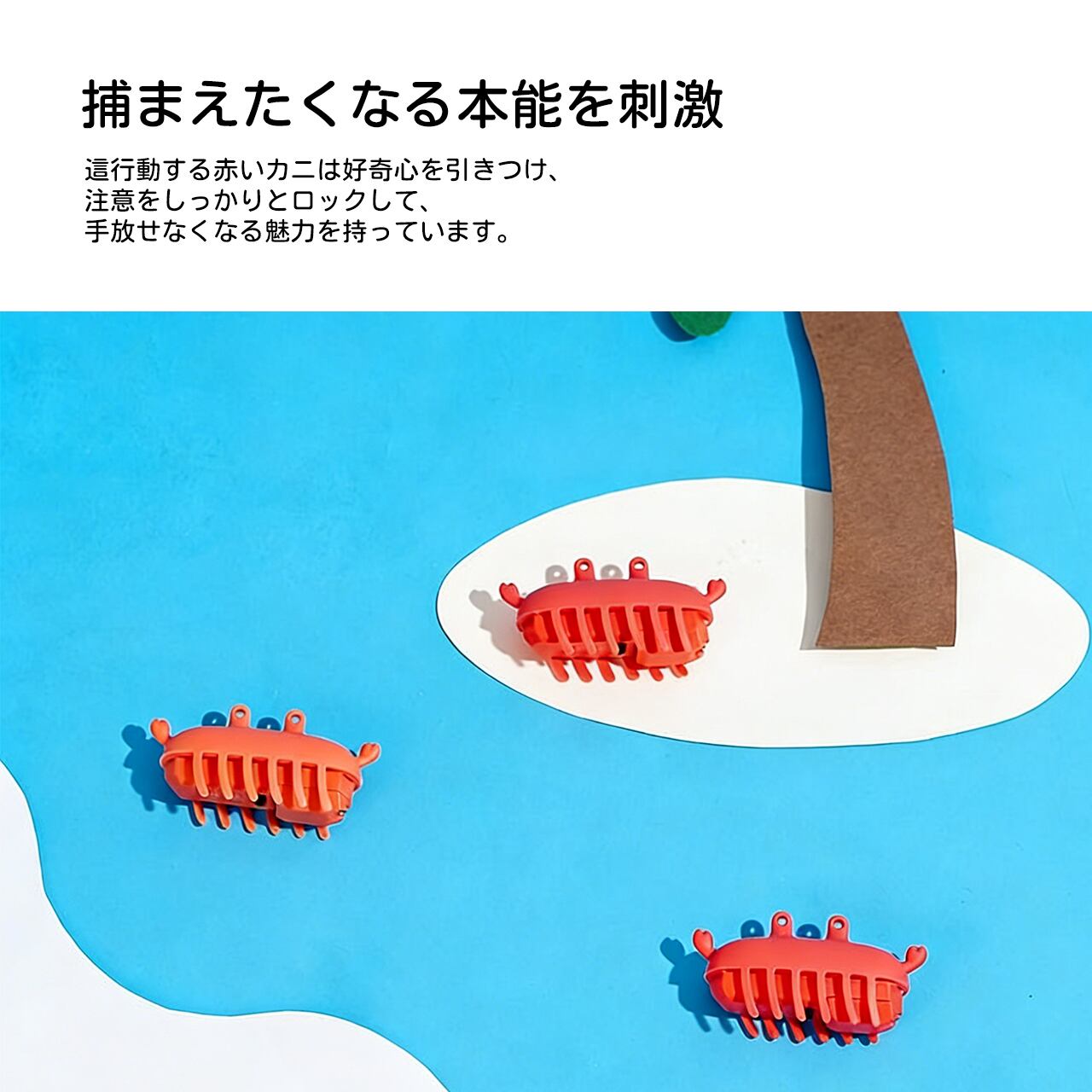 室内で楽しく遊べるおもちゃです。広いスペースがなくても、猫ちゃんはこのカニの動きに夢中に。