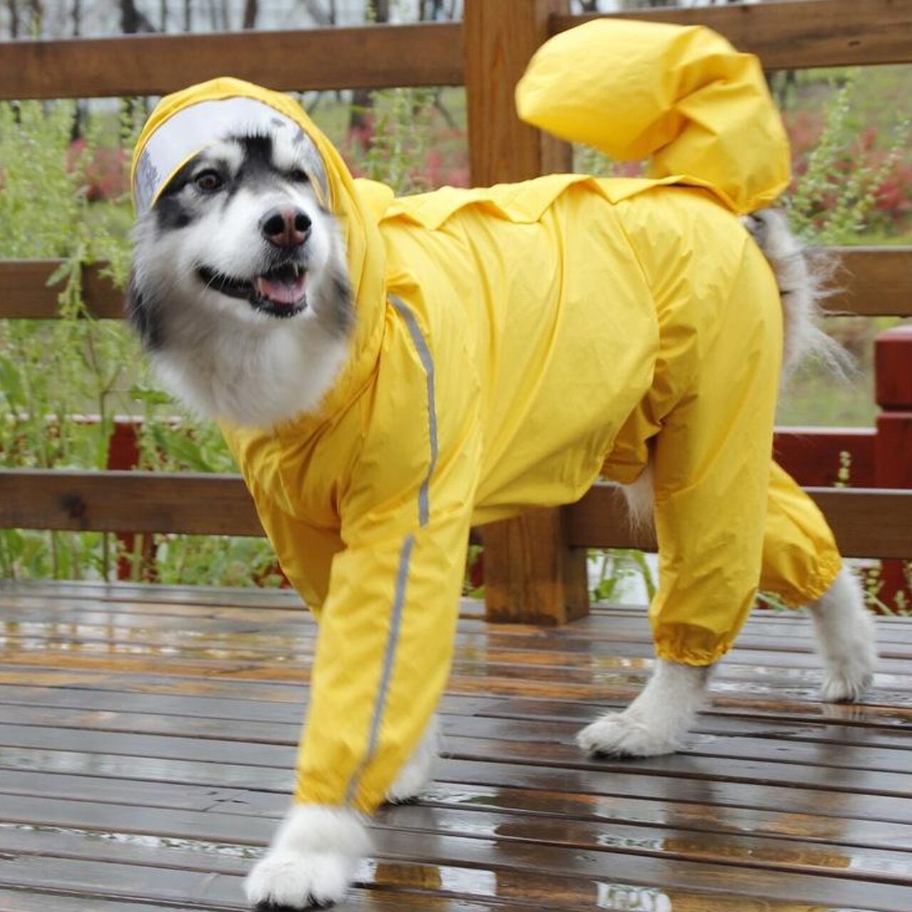 → 中型~大型犬のために開発された、4 足フルカバー式レインコートです。ナイロンコーティング生地で完全防水、フードには透明なバイザー付きで視界を遮らず、尻尾カバーも取り外し可能。背中のファスナーで着脱が簡単、反射条で夜間の安全性も確保。ゴールデンレトリバー、ラブラドール、ハスキー、アラスカンマラミュートなどの大型犬にぴったりで、雨の日のお散歩やアウトドアで愛犬をぬれや汚れから守り、お家の掃除の手間を大幅に減らしてくれる、飼い主必携のアイテムです。