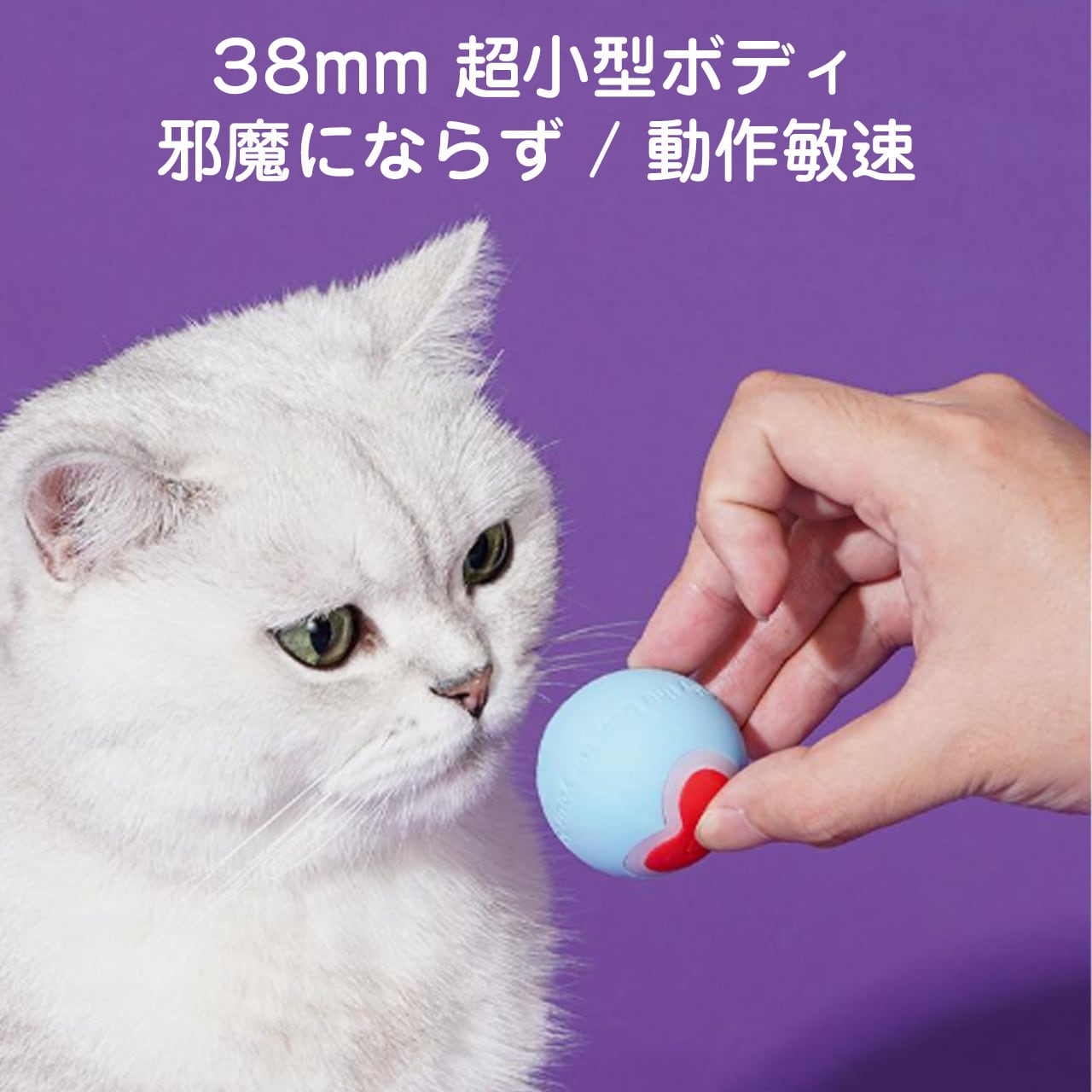 L38×W38×H38mm のミニサイズで、猫ちゃんの小さな口や爪にフィット、持ちやすく転がしやすい。