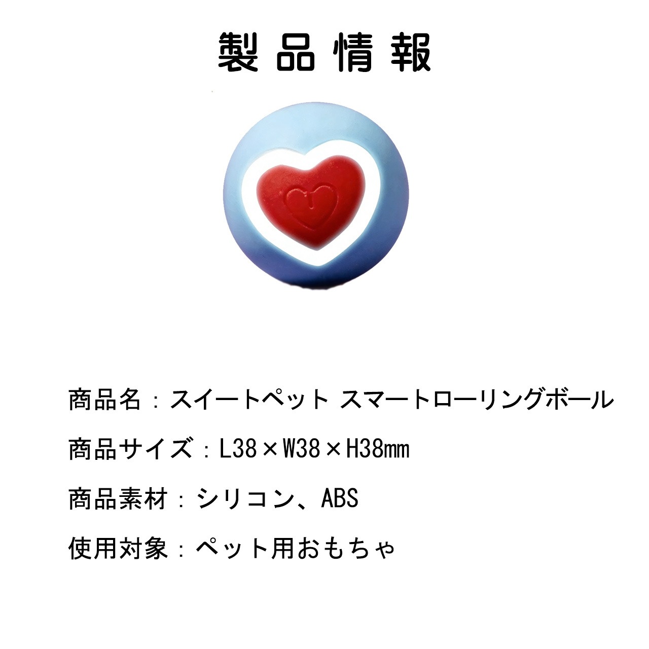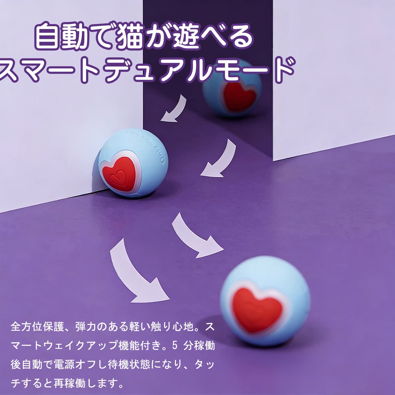 → かわいいハート柄が魅力的な、猫用スマートローリングボールです。自動で転がるインテリジェント設計で、猫ちゃんが一人でも夢中で遊べ、留守番中の退屈を解消。シリコン + ABS の安全素材で噛み応えも抜群、子猫の歯固めにも最適。38mm のコンパクトサイズで猫ちゃんの小さな口にもフィットし、猫じゃらしのように猫ちゃんの狩猟本能を刺激し、運動不足やストレスを解消してくれる、猫飼い必携のアイテムです。