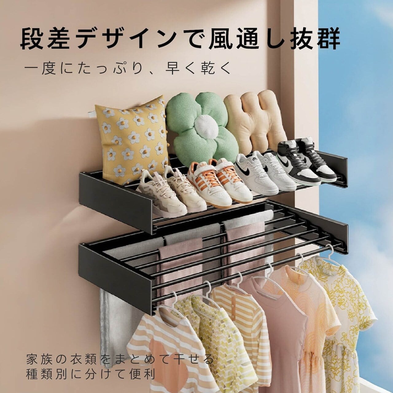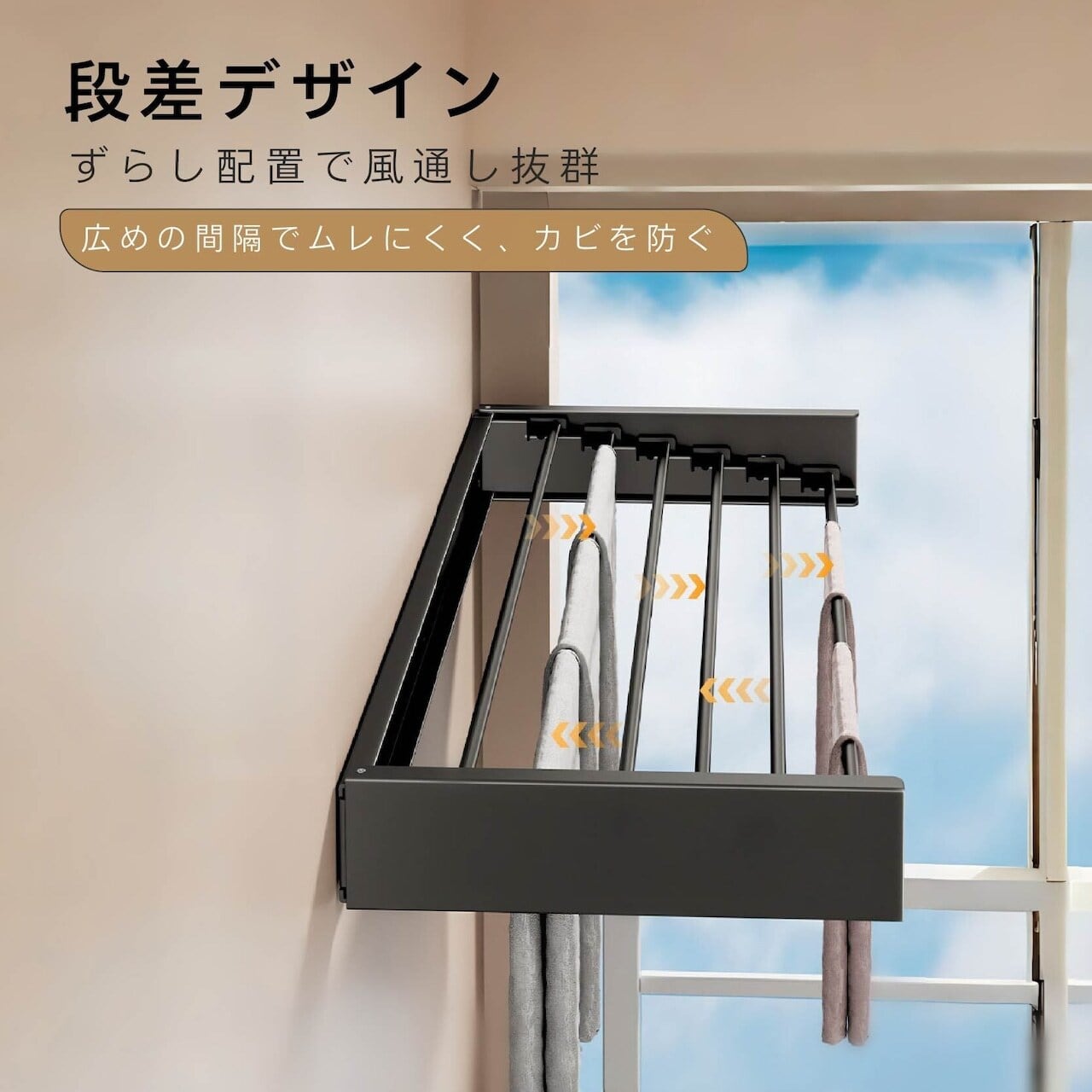 掛け杆に段差をつけることで、洗濯物同士の重なりを防ぎ、風通しが良く、早く乾きます。カビの発生も防ぎます。