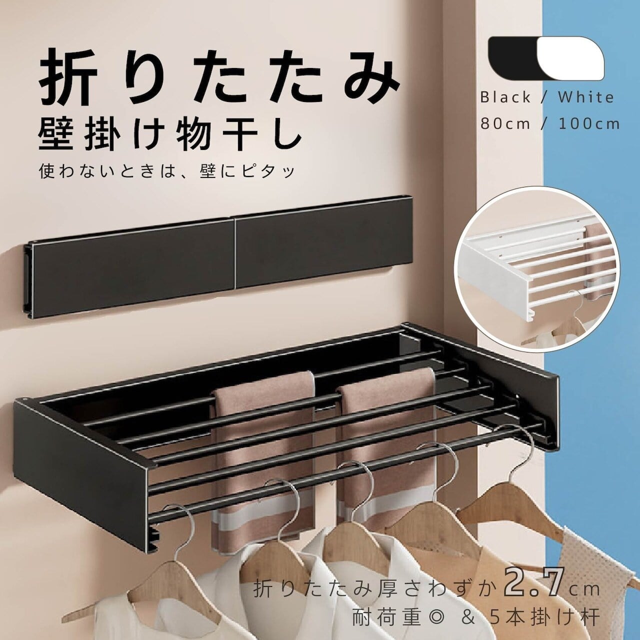 H14 . 【折りたたみ式・壁掛け】物干し 5本掛け杆 耐荷重 防錆加工 80/100 cm ブラック/ホワイト 接着式 免打孔