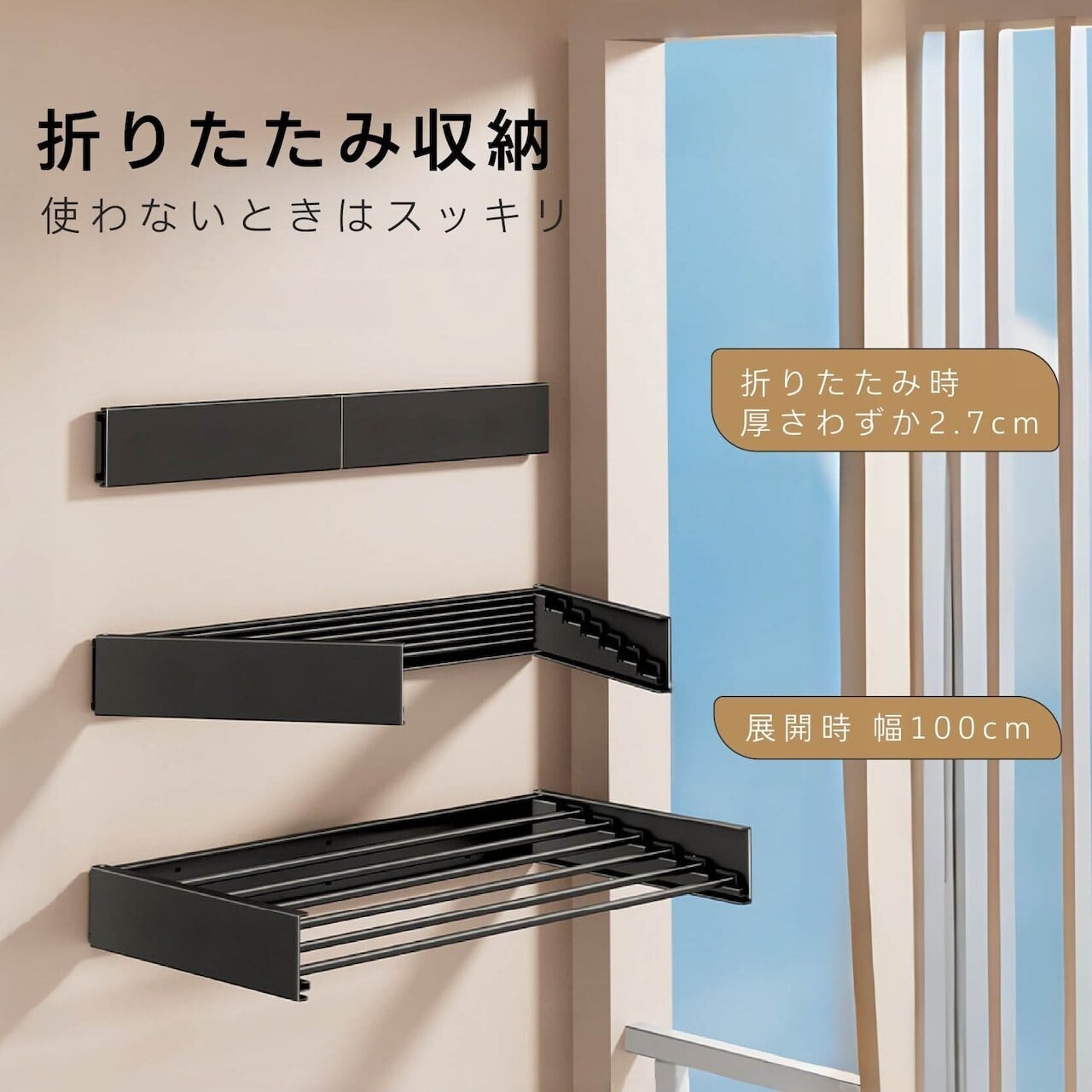 使わないときは折りたたんでコンパクトに収納。必要なときだけ広げてたっぷり干せます。折りたたみ厚わずか2.7cmで、お部屋のすっきりをキープ。限られたスペースも有効活用できます。