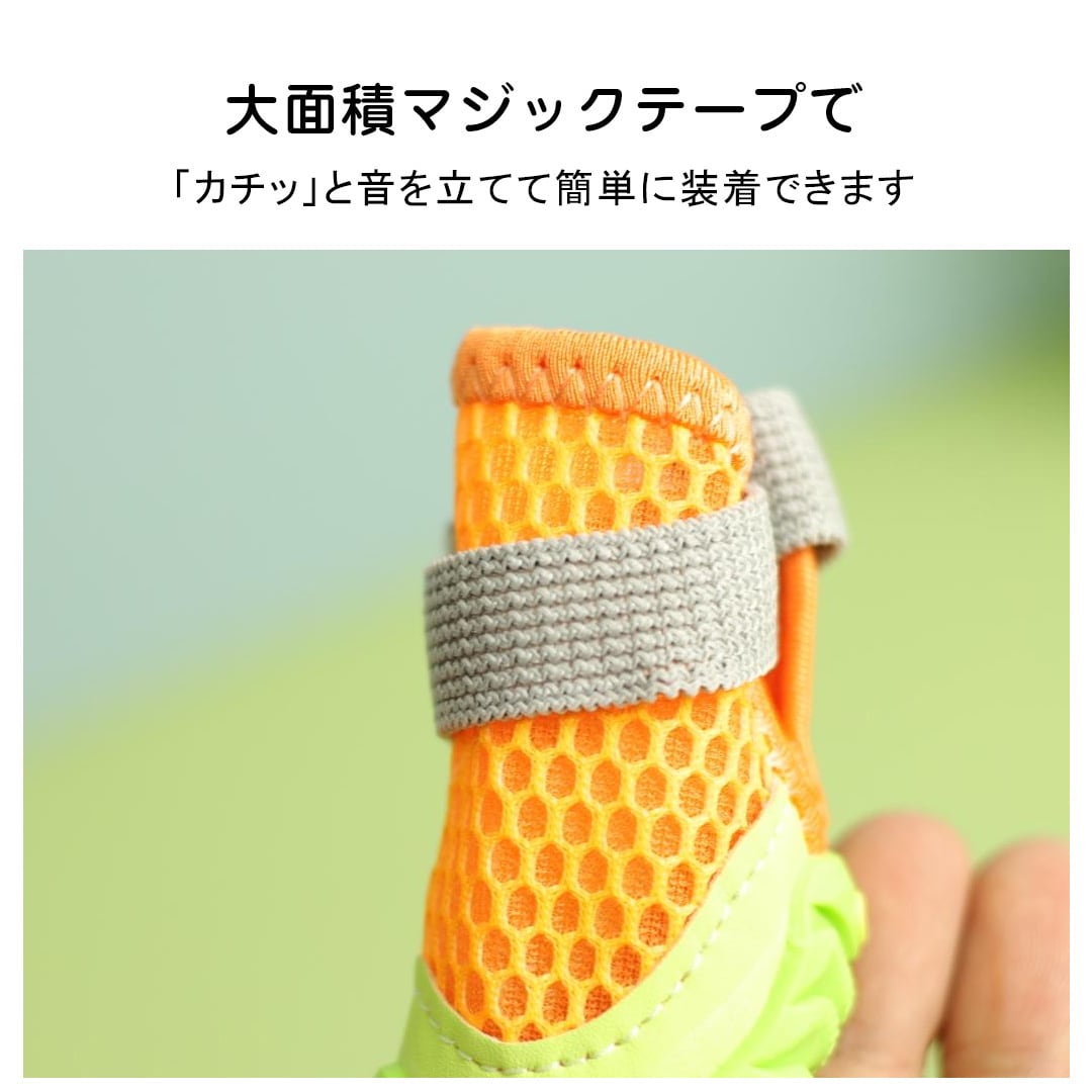 大きなメッシュ素材を使用し、通気性が抜群。夏の暑い日でも足が蒸れにくく、快適にお散歩できます。