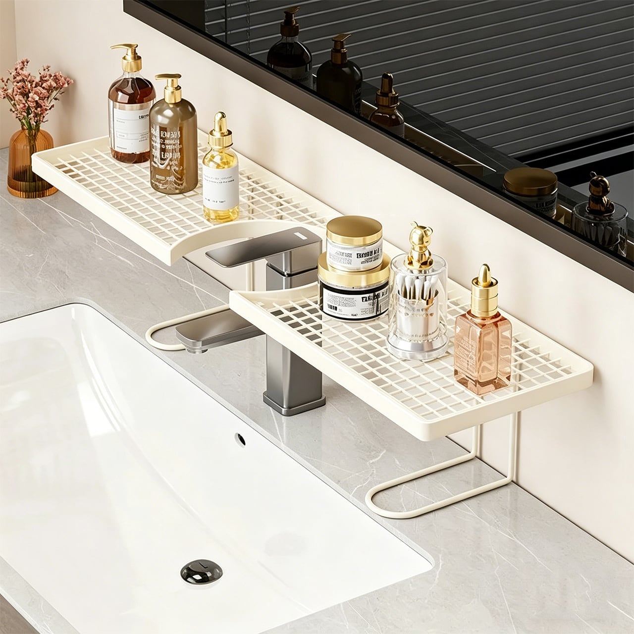 幅広のU字型溝により、重たい化粧品やスキンケア用品もしっかり保持。落下の心配なし。