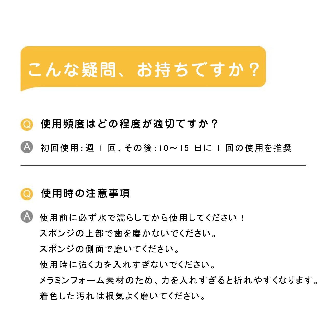 特殊な気泡構造のメラミンフォームが、歯の表面の汚れを優しく絡め取ります。研磨剤不使用で、歯を傷つけずにケアできます。