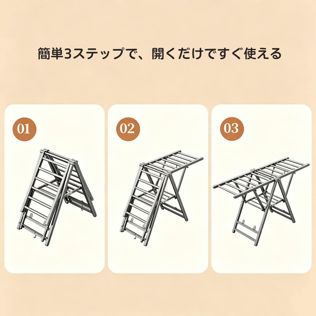 「開くだけですぐ使える折りたたみ物干しラック」で、毎日の洗濯がスムーズに。