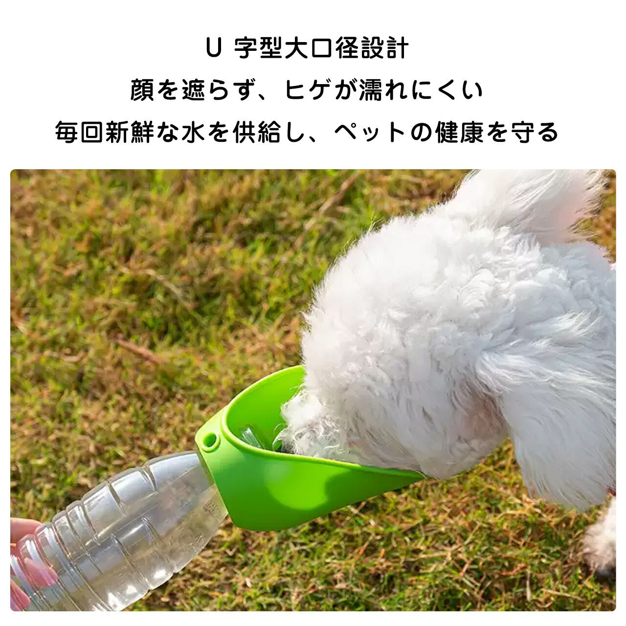→ 市販のペットボトルにそのまま取り付けられる、シリコン製ペット用給水器です。柔らかく安全な素材で、ワンちゃんが飲みやすい U 字広口設計。お散歩やお出かけ、ドライブなどに大活躍します。