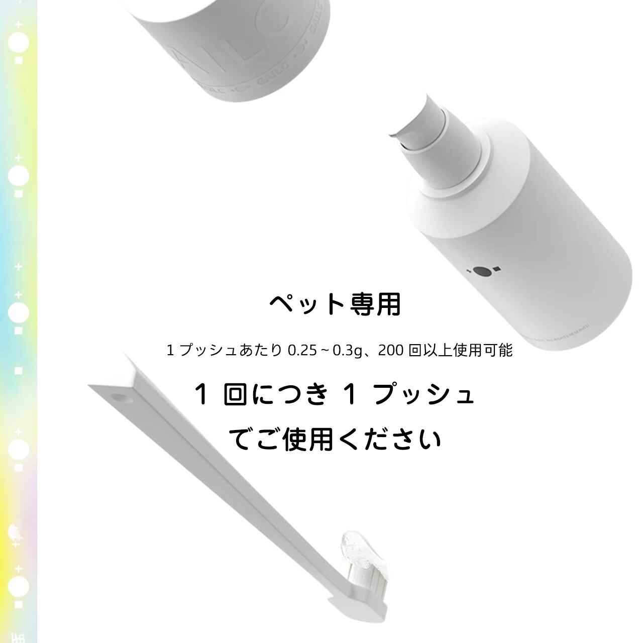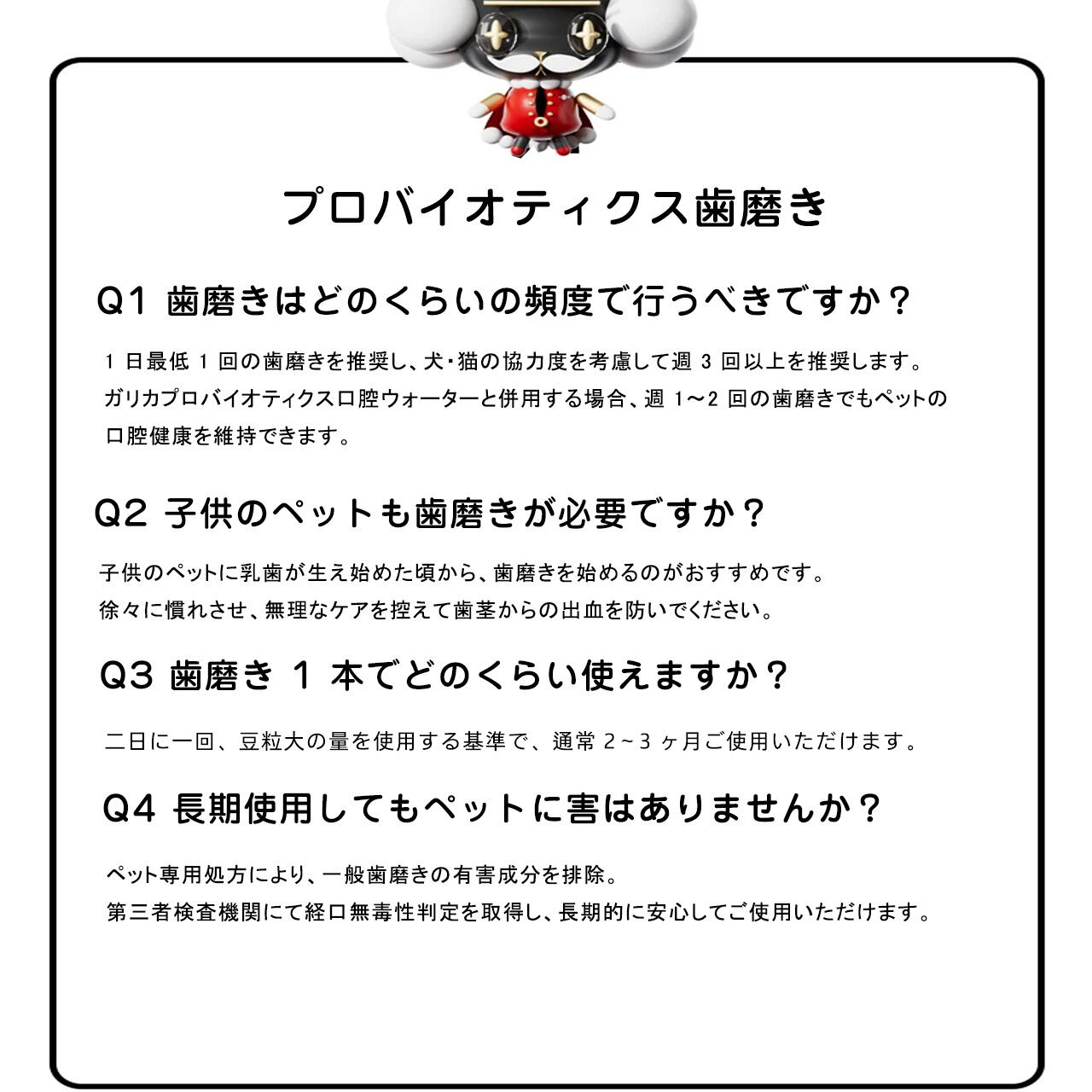 ※ 幼いペットへの使用:乳歯が生え始めたら使用可能。まず指で舐めさせて味に慣れさせ、無理なく始めてください。