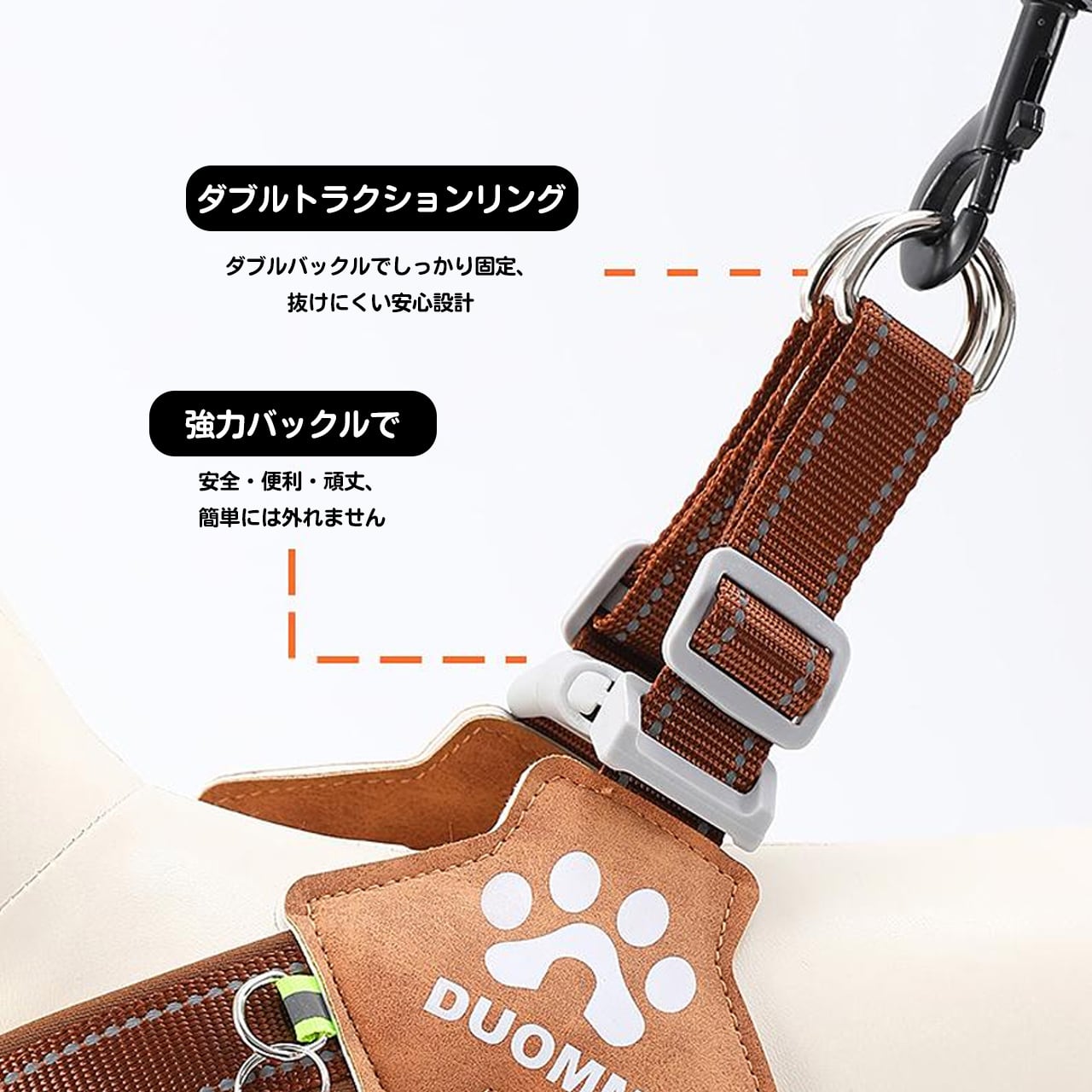胸部と背中のダブルリングでしっかり固定。強力バックルで簡単には外れず、中型・大型犬でも安全。引っ張り癖のある犬にも安心設計です。